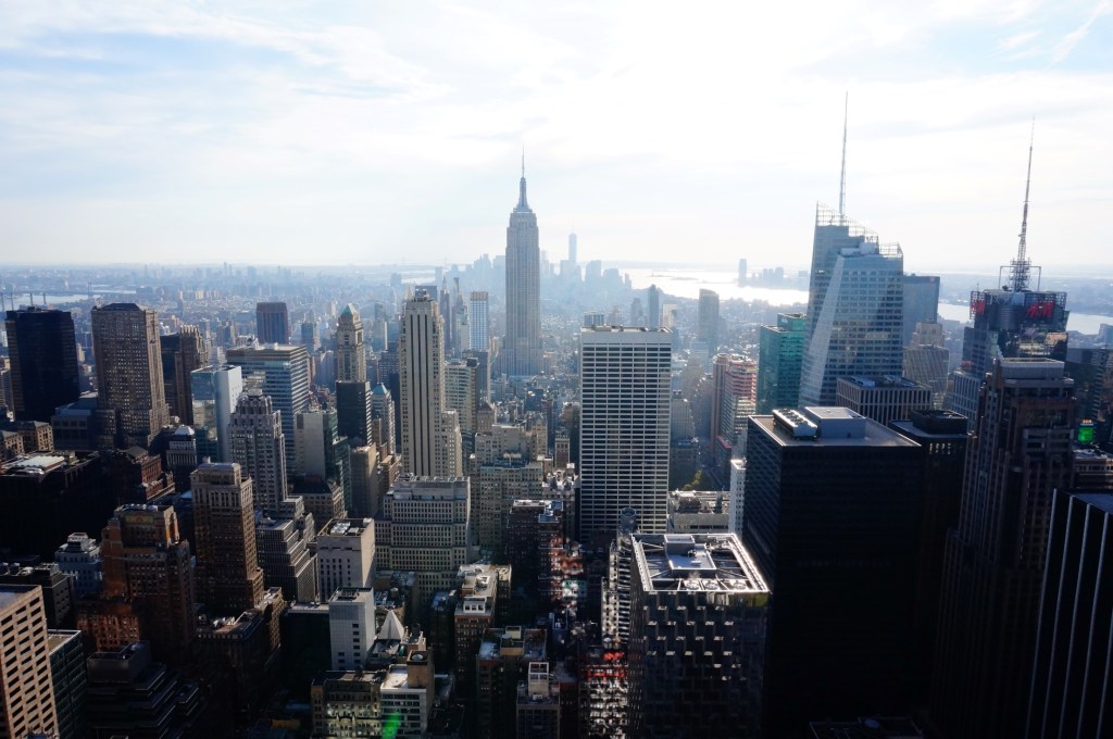 We gaan met plezier op in het stadse tafereeltje, maar we zijn hier voornamelijk voor Top of the Rock. Dat is een van de, zoniet het beroemdste panoramische uitzichtpunt van de stad en het torent een indrukwekkende 250 meter boven straatniveau. Da’s lager dan het panoramaplatform van het Empire State Building en veel lager dan het gloednieuwe One World Observation Deck, maar Top of the Rock staat alsnog bekend omwille van haar onvergetelijke views op Central Park en downtown Manhattan. Is het de moeite waard? Tja, dat moet je zelf bepalen. Dertig dollar is immers niet niks om snel wat standaardfoto’s te scoren. Dankzij het heldere weer kunnen we echter vele kilometers in de verte staren (hallo Vrijheidsbeeld!) en het is sowieso best een fijn gevoel om op het dak van deze wereldstad te staan.