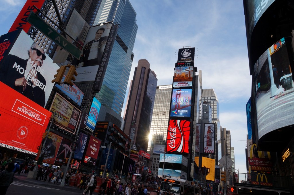 Times Square, het centrum van de wereld. Reuzen van staal, beton en glas omsluiten een plein waarop de massahysterie vol haastige locals en nieuwsgierige toeristen nooit echt schijnt uit te doven. Zonnestralen reiken hier omwille van de enorme kantoorgebouwen eerder zelden tot het straatniveau, maar toch baadt Times Square 24/7 in een kristalheldere gloed. Billboards en reclameschermen variëren van klein en middelgroot tot aan de meest absurde proporties die je ooit voor mogelijk hield. Tel het aantal vierkante meters aan flitsende led-schermen op en je evenaart wellicht de oppervlakte van een gemiddeld Vlaams dorp.