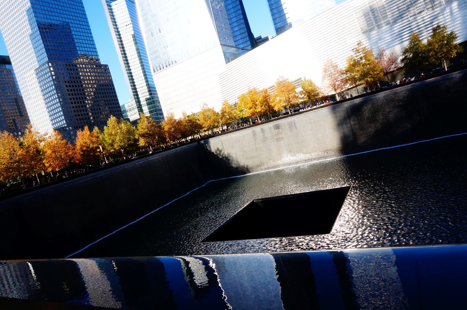 We zijn klaar voor de zonovergoten namiddag. Het vrolijke weertje staat echter in schril contrast met de wrange sfeer die we proeven. Via Trinity Church en een bescheiden glimp op zakencentrum Wall Street arriveren we namelijk bij Ground Zero. Wanneer we de huidige oase van groen en sereen klaterend water bereiken, is het moeilijk om in te beelden dat hier ooit twee 110 verdiepingen tellende wolkenkrabbers stonden. Het is echter nog onmogelijker om de chaos en destructie van die bewuste zwarte dag in 2001 voor te stellen. 11 september was aanvankelijk immers een doodgewone zonnige najaarsdag, net als deze derde november ruim dertien jaar later. Tegenwoordig wordt de ruimte benut door een minimalistisch, doch imposant monument dat de grondafdruk van de voormalige gebouwen benadrukt. Rondom twee schijnbaar oneindige watervallen graveerde men de namen van de slachtoffers die 9-11 maakte. Hier en daar ontdekken we een witte roos bij de gravures; het stille signaal dat de persoon in kwestie vandaag jarig geweest zou zijn. Je moet al een onmens zijn om Ground Zero als emotioneel nietszeggend te ervaren. Laat de ijzingwekkende stilte op de nochtans druk bezochte herdenkingsplaats daar een ijzersterke getuige van zijn.