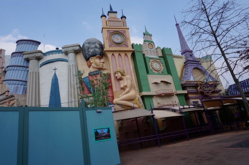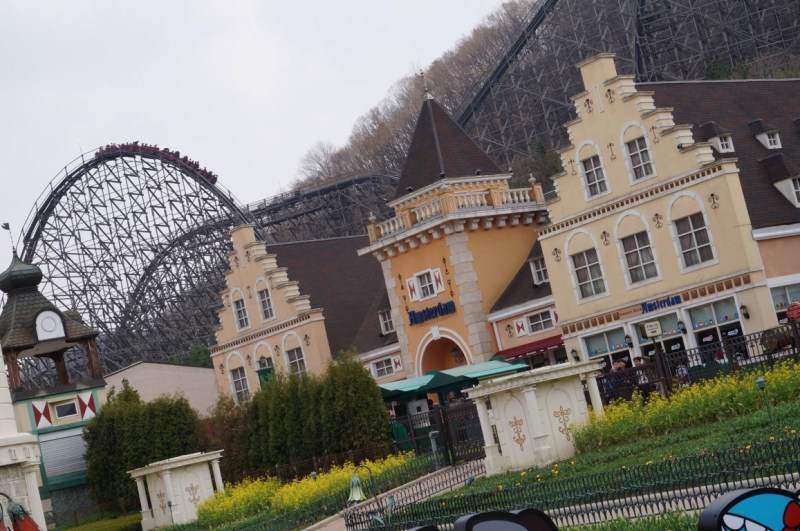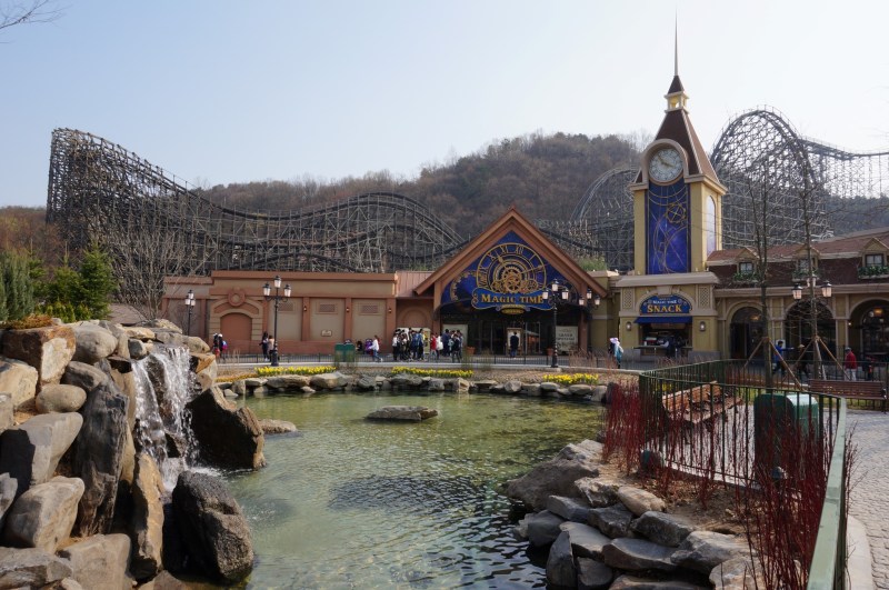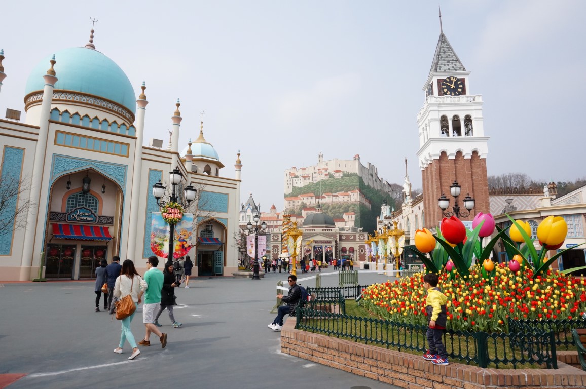 Everland heet ons welkom met Global Fair. Met sierlijke Russische torentjes, een Zuid-Europese heuvelbebouwing, een Frans paleis en een waardeloze kopie de Venetiaanse Campanile maakte men hier een schijnbaar willekeurige selectie van vreemde culturen. Hoewel het allemaal een tikje out-of-date oogt, is de omvang van deze zone verrassend. Global Fair pronkt met grootse gevels, bloementapijten staan prachtig in bloei en op de achtergrond speelt een krachtige soundtrack om de dag te starten. Net zoals Lotte World blijkt ook Everland niet vies van een portie kopieerwerk uit Disney. Zo kan je de centrale wonderboom als een subtiele verwijzing naar Animal Kingdom beschouwen, terwijl een Victoriaans bouwsel dan weer letterlijk aan de Crystal Palace-restaurants uit Amerika en Japan doet denken. Ik vermoed dat wij vandaag de enige twee bezoekers zijn die het überhaupt opmerken.