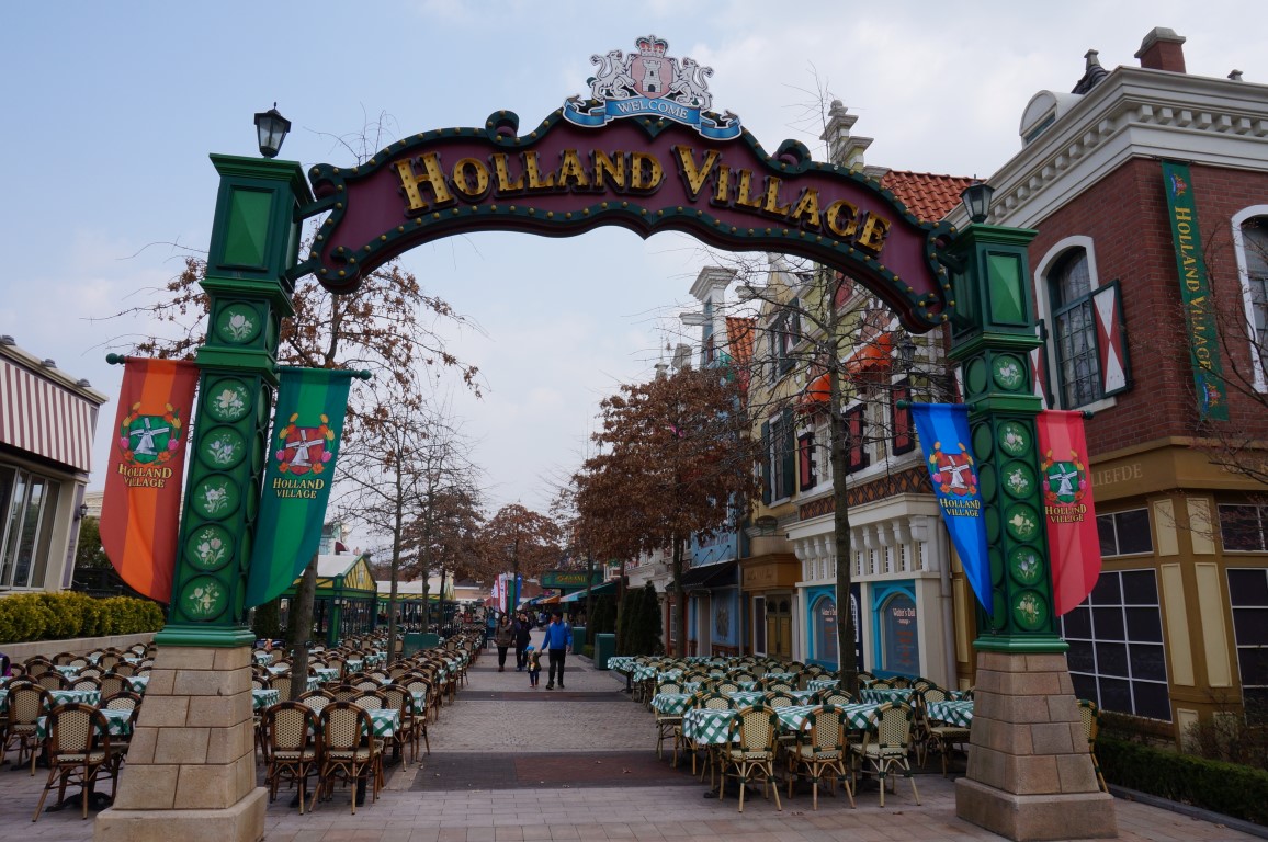 Geachte Nederlanders, jullie genieten een sterrenstatus in Everland. Jullie kregen niet alleen de eer – kuch – om opgenomen te worden in Global Village, maar jullie hebben ook een eigen themazone op 8.000 kilometer van huis. Holland Village grenst aan de wondermooie siertuinen van het park en is voornamelijk gericht op horeca. Het is een cute dorpsstraatje dat volgestampt werd met gezellige terrassen. Volgens de raamopschriften koop je hier in willekeurige volgorde kaas, noot, luchtig worst en chocolade voor je geliefde, maar in realiteit gaan er toch voornamelijk Aziatische rijstschotels over de toonbank. Een buitengewoon realistisch beeld schetst Holland Village dus niet over jullie thuisland. Tegenwoordig vermoedt elke Zuid-Koreaan bovendien dat er naast elke Hollandse gevelrij een gigantische houten achtbaan staat.