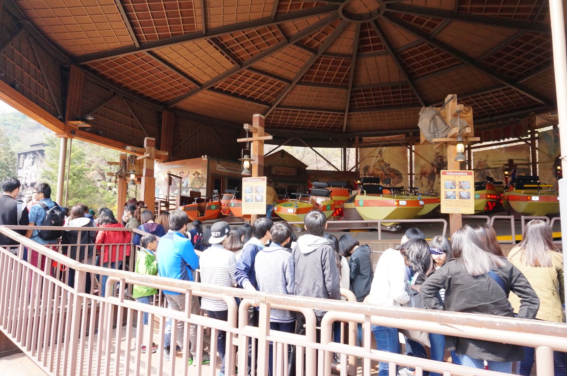 We begonnen vanochtend met een grijs wolkendek, maar het weer klaarde tijdens de middag helemaal op. Ideale omstandigheden om de plaatselijke rapid river na een wachttijd van zowat 30 minuten aan te vinken. Amazon Express ligt in een knappe bosrijke omgeving en werd ingeklemd tussen Safari World en Lost Valley. Ook tijdens deze rondvaart komen we overigens beestjes tegen, maar dan in een plastic variant. De kenmerkende hoge boten duiden al snel op een Hafema-variant en dat duidt meestal op een saaie rit. Maar schijn bedriegt en we mogen van geluk spreken dat Everland haar bootjes tijdens de lente van een afdekzeil voorziet. Damn, wat een stroomversnellingen en golven!