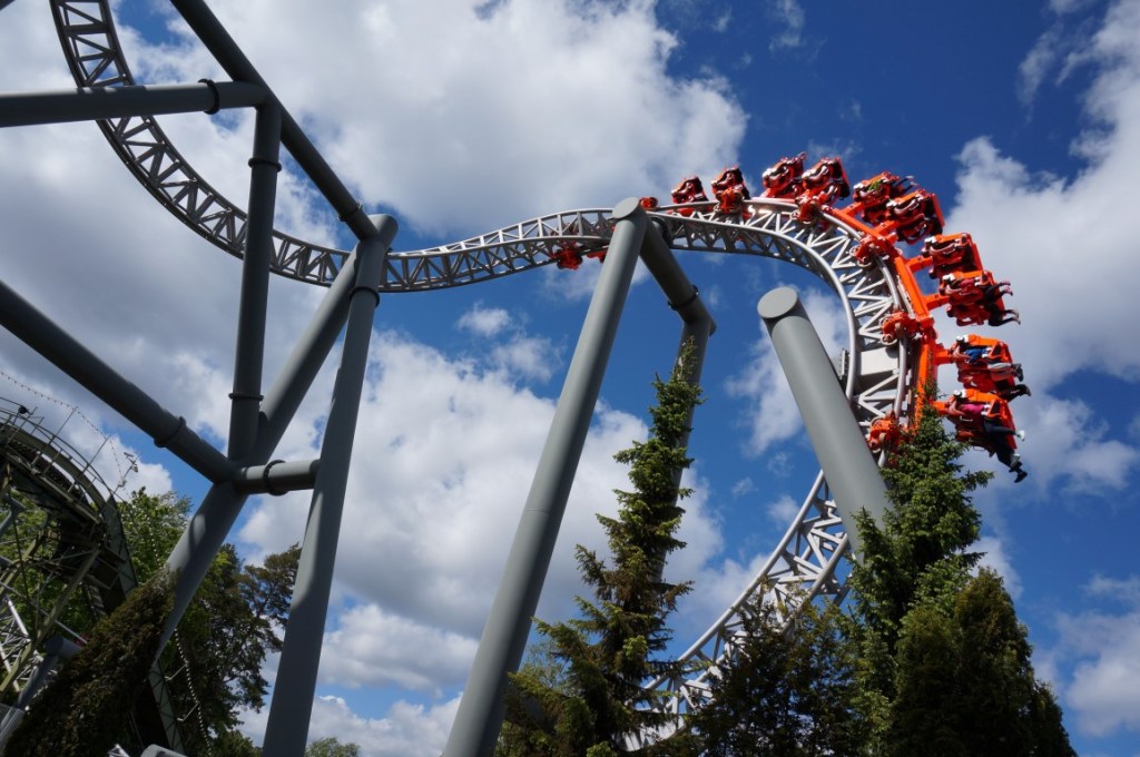 De setting klopt alvast voor de volle honderd procent. Scoort het eigenlijke attractiepark even hoog? Ik ga het vlug ontdekken en Tornado lijkt me de uitgelezen manier om daaraan te beginnen. Deze inverted coaster van Intamin nestelde zich middenin het park en werd niet op de meest alledaagse wijze in het landschap verwerkt. Ik vind het aanvankelijk een tamelijk kale bedoening. De ingang van de attractie ligt immers op een groot betonnen plein dat op ‘t eerste zicht helemaal niet nuttig lijkt. Pas wanneer ik via trappen op het perron van de achtbaan arriveer, besef ik dat die troosteloze vlakte het dak van het stationsgebouw is. Grijs is duidelijk de overheersende kleur en men deed geen moeite om de techniek van de ride en het station ook maar enigszins weg te werken. Gelukkig camoufleerde men ook de rotswanden waartussen Tornado opgetrokken werd niet en zo ontstaat een minimalistisch industry meets nature sfeertje. Je houdt ervan of je haat het, maar je hart gaat sowieso sneller kloppen wanneer je tijdens het instappen wordt opgeschrikt door een voorbijrazende trein. Die wurmt zich op dat moment door een wel erg speciaal gepositioneerde inversie. M’n eerste indruk is een goeie.