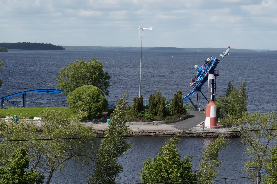 Bovendien laat de groene armband me toe om meer verschillende facetten van Särkänniemi te ontdekken. Naast een attractiepark, vind je hier immers ook een dolfinarium, een klein dierenpark, een aquarium, een planetarium en de Näsinneula-toren. Deze bijna 170 meter hoge observatietoren is al van ver herkenbaar. Je kan als parkgast naar het 120 meter hoge panoramaplatform sjezen of – als het wat meer mag zijn – kan je lunchen in het één verdieping hoger gelegen ronddraaiende restaurant. Ik hou het bij de budgetoptie en geniet van het prachtige uitzicht op deze heldere middag. Het wordt daarboven niet enkel duidelijk dat Tampere zich middenin een eindeloze massa van natuurpracht nestelde, maar ook dat Särkänniemi locatiegewijs niet moet onderdoen voor pakweg Tivoli Gröna Lund.