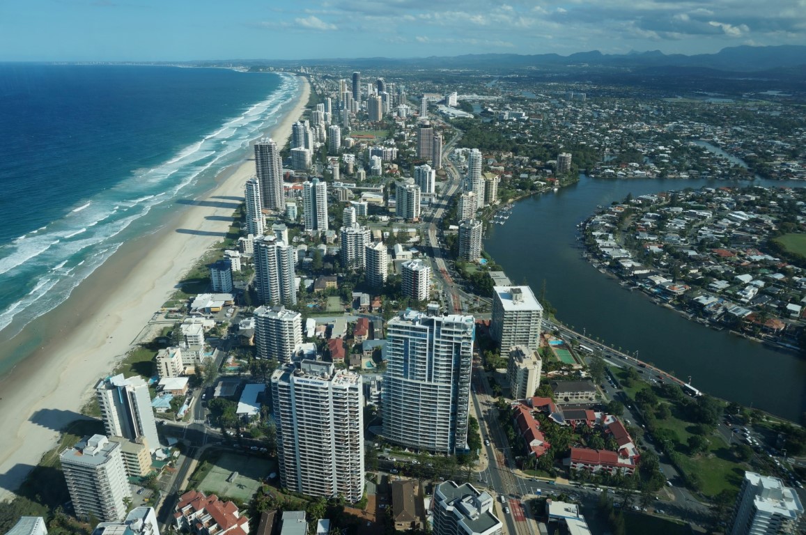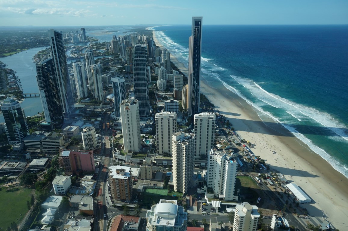 Gold Coast doet niet enkel qua sfeer, maar ook qua uitzicht aan Miami denken. Wanneer we de stad vanuit Brisbane naderen, ontvouwt er zich immers een aantrekkelijke skyline vol moderne hoogbouw. Honderden hotelkamers en residenties proberen hoog in de lucht het ultieme uitzicht te genereren, maar daarvoor moet je je bankrekening al aardig plunderen. Weet echter dat er een gemakkelijkere en opvallend goedkopere manier is om Gold Coast vanuit de hoogte te bewonderen: SkyPoint.