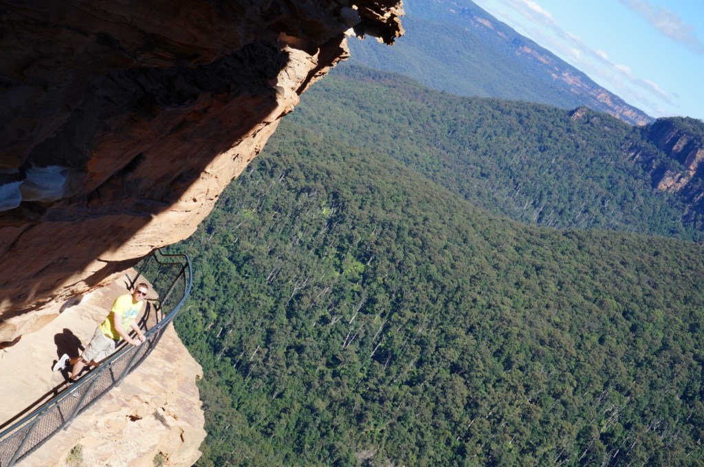 Naast de twee kabelbanen is er bijvoorbeeld deze Scenic Railway, die je toelaat om het National Park vanuit een heel ander perspectief te bekijken. We vinden het jammer dat Orphan Rocker daar SBNO staat, maar ook de kabeltrein levert ons een aardige portie sensatie op. De funicular in Scenic World is immers supersteil en we dalen af in de vallei met een waanzinnige hellingsgraad van 52°. Doen we vervolgens wat elke derderangs-toerist doet? Nemen we die kabeltrein terug naar boven? Neen Nein Non No! Michaël en ik gaan immers hiken zoals de echte pro’s dat doen. We opteren voor de bekende, doch aardig zware wandeling langs The Giant Staircase. Het komt erop neer dat we in de vallei naar The Three Sisters lopen, waarna we een van die zusjes beklimmen. En ik besef maar al te goed dat die zin dubbelzinniger klinkt dan hij bedoeld is.