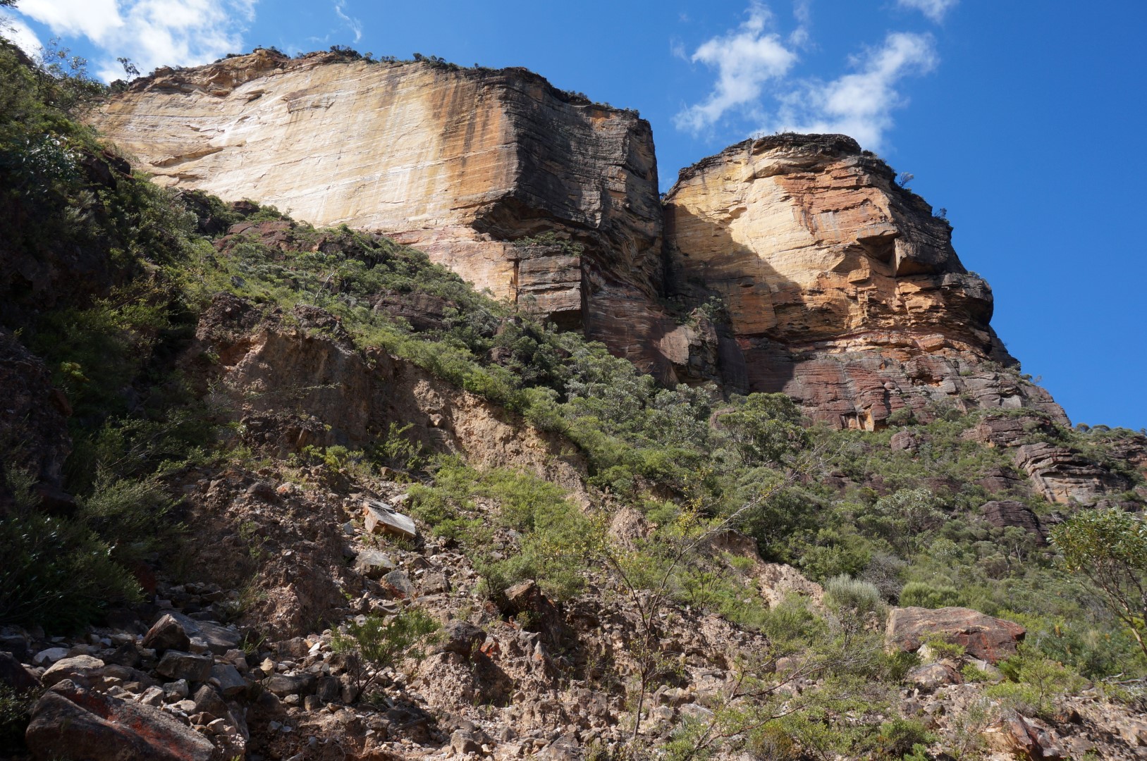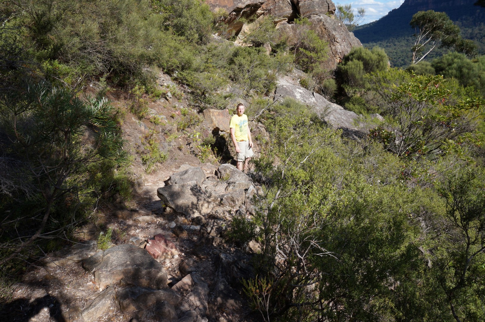 Michaël en ik moeten echter uit de kast komen. We zijn ehm… niet zo professioneel zoals ik daarnet beweerde. Wanneer we niet meteen een pijl naar The Giant Stairway vinden, gaan we er namelijk van uit dat men met Golden Stairs hetzelfde bedoelt. Maar knoop dit goed in je oren wanneer je ooit hierheen komt: The Giant Stairway en Golden Stairs zijn niet hetzelfde. Dat beseffen we helaas pas later vanmiddag. Voordien banen we ons (weliswaar met succes) een weg door een opeenvolging van grillige rotsblokken, omgevallen boomstammen en grondverzakkingen. Avontuurlijk is het zeker, maar voor The Three Sisters moeten we toch écht naar de andere kant.
