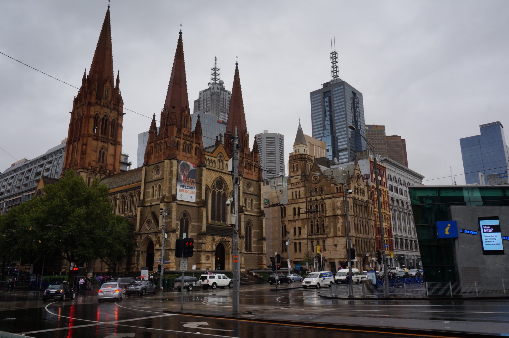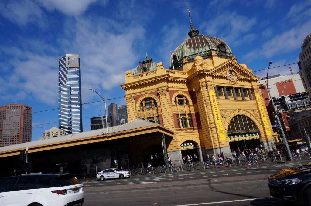 Onze dag begint op het meest levendige punt van de stad en dat ligt (logischerwijs) rond het belangrijkste treinstation. Net zoals in vele wereldsteden het geval is, werd dat stationsgebouw zelfs een handelsmerk voor Melbourne. Ken je die coole monument-symbooltjes die op Facebook verschijnen wanneer je ergens heen reist? Wel, als je de trip naar Melbourne onderneemt, verschijnt er op je Facebook-status een gestileerd okerkleurig gebouw met een groen koepeldak. Dat is Flinders Street Station. Natuurlijk valt er in zo’n treinstation bitter weinig te beleven als je zelf geen trein nodig hebt. We kunnen hier dus weinig meer doen dan het verplichte fotootje maken, om vervolgens naar de volgende toeristische hotspot te wandelen. Gelukkig voor ons vinden we die gewoon aan de overkant van de straat.
