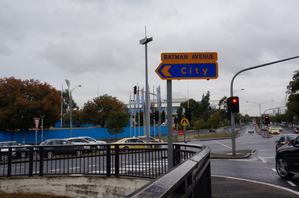 Heel boeiend is het sportcomplex Melbourne Park niet wanneer je de stadions vanaf een afstandje moet bekijken. We moeten onze fun dus elders zoeken en ik word op mijn wenken bediend door een drukke laan die quasi rechtstreeks aan de Rod Laver Arena grenst. Dat is niet de mooiste, drukste of gekste straat ter wereld, maar het is de naam die met originaliteitsprijzen gaat lopen. Want geef toe: wie wil er geen selfie met het straatnaambord op Batman Avenue? En welke Robin droomt er niet van om op nummer 38 van Batman Avenue te wonen? We beelden ons stiekem wel effe in dat Melbourne en Gotham City vergelijkbare steden zijn.