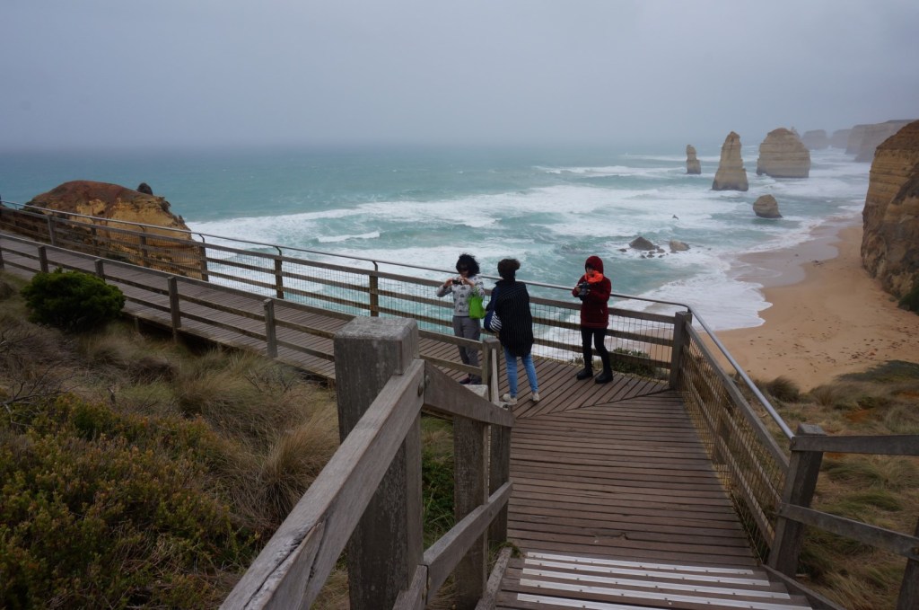The Twelve Apostles is een monument in het Australische toerisme en het is er dus bijna altijd druk. Iedereen wil immers wel een foto komen maken van die legendarische rotskust en weet je wat? Dat stoort niet. Het toeristische centrum en de daarrond aangelegde viewpoints zijn immers ruim en praktisch opgezet. We moeten op deze middag alleszins niet drummen om een glimp van het natuurschoon op te vangen en we hoeven geen tienduizend Chinezen weg te duwen voor een foto. Ja echt: Port Campbell National Park en haar beroemdste twaalf… ehm, acht inwoners zijn comfortabel te bewonderen en ik geniet (ondanks het miezerige weer) met volle teugen van dit visuele vermaak.