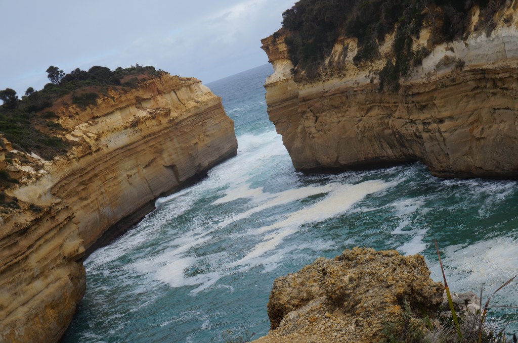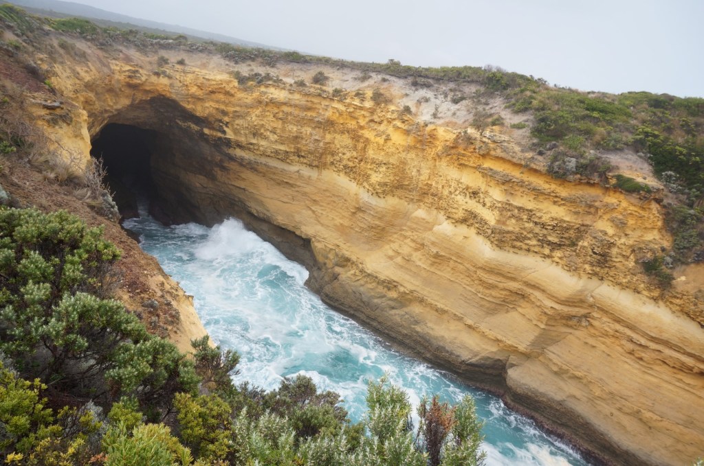 Tja, het weer werkt vandaag inderdaad niet echt mee en dat is jammer. Maar langs de andere kant maakt zo’n donkere hemel de foto’s ietwat dreigender en bovendien levert de felle wind duidelijk stevige golven op. Glenn likes that. Ook de nabijgelegen rotsformatie The Razorback (een flinterdunne muur van kalksteen) en Thunder Cave (een grot waarin het oceaanwater met zo’n enorme kracht tegen de wanden slaat dat er een donderend geluid ontstaat) zijn een bezoekje meer dan waard. Net zoals dat bij elk Australisch National Park het geval is, zijn ook hier de parkings en wandelroutes trouwens in perfecte staat.