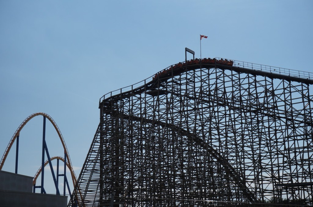 Net zoals de meeste Noord-Amerikaanse pretparken van enige omvang, heeft ook Canada’s Wonderland z’n eigen waterpark. Het zogenaamde Splash Works is inbegrepen in de toegangsprijs en op deze hete dag kan je er over de koppen lopen. Wij passen voor dat waterplezier, al komen we dankzij The Mighty Canadian Minebuster toch ontzettend dicht bij de zwemmers. Vraag me niet waarom, maar deze woodie sjeest rakelings langs de glijbanen van Splash Works. Het is verfrissend (letterlijk, want we vangen nevel op van de slide waar we onderdoor razen) en bovendien is deze Minebuster erg leuk. De baan heeft een klassieke out-and-back lay-out en hij is een tikkeltje ruw, maar dat stoort helemaal niet. De snelheid ligt namelijk hoog en het ding heeft hopen airtime.
