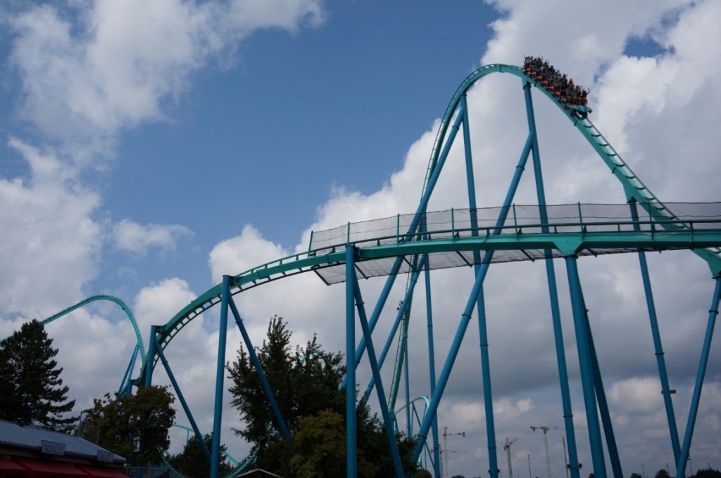 Leviathan bijvoorbeeld. Zullen we dus maar meteen met de meest iconische achtbaan van dit Canadese coasterpark beginnen? We staarden van op de parkeerplaats al naar de helderblauwe rails van deze gigant, maar inmiddels staan we aan het stationsgebouw. Op het knappe logo na, is dat overigens een vrij kale bedoening. Dat gebrek aan thema gaat door in de wachtruimte, dus ik ben dolblij dat we de twee uur durende wachttijd mogen overslaan. Dankzij ons voorkruipbandje worden we namelijk een kwartier later al omhoog getakeld. Leviathan neemt ons naar een indrukwekkende hoogte van 93 meter en gooit ons daarna met een topsnelheid van bijna 150 kilometer per uur naar beneden. Dat zijn stevige statistieken en het vertaalt zich moeiteloos naar een fantastische ritervaring. Deze baan is immers niet alleen hoog en snel, maar ook bizar soepel. Het enige element dat ik mis, is lengte. Leviathan is met z’n 1.672 meter beslist geen korte baan, maar toch lijkt het alsof men op ‘t einde heel veel power onbenut laat. Je vliegt aan volle vaart en op een hoogte van zowat 30 meter de remmen in… en dat voelt gewoonweg niet juist. Op dat vlak scoort Fury 325 (het iets grotere zusje van Leviathan) opmerkelijk beter. Die baan wordt namelijk wel afgesloten met enkele lagere airtime-heuvels en krachtige bochten.