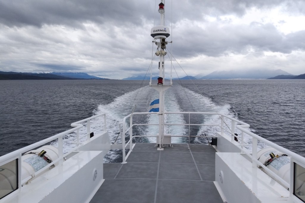 Er zijn een heleboel rederijen die boottochten vanuit Ushuaia organiseren, dus er heerst ‘s ochtends heel wat drukte rond de pier. Al die organisaties hebben een bureau in een schattig miniatuurdorp vol tuinhuisjes, dat aan de kade ligt. In het hokje van Piratour ruilen we de voucher in voor onze badges, waarna we via de douane (die nog snel 40 pesos haventaks uit m’n portfeuille graait) richting onze boot lopen. Het valt meteen op dat onze zogenaamde Eclaireurs een comfortabel schuitje is. De verwarming doet ons het kille weer vergeten en de bankjes zitten heerlijk. Een mooi begin.