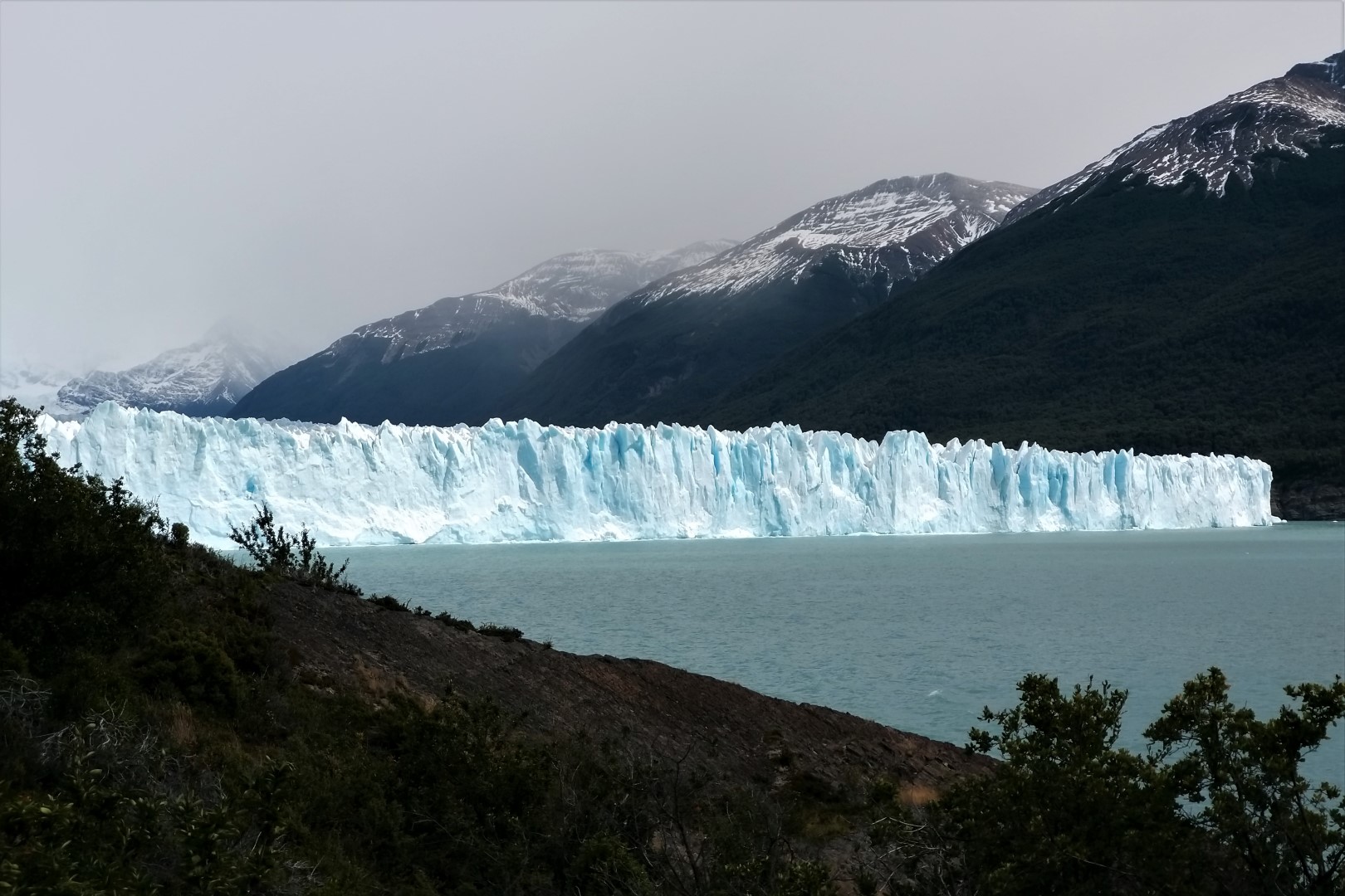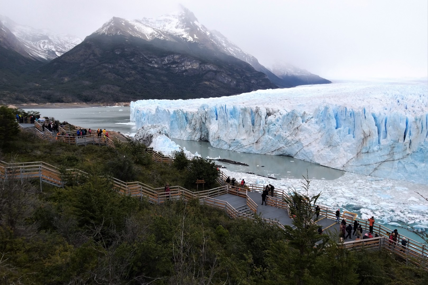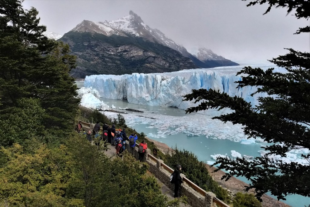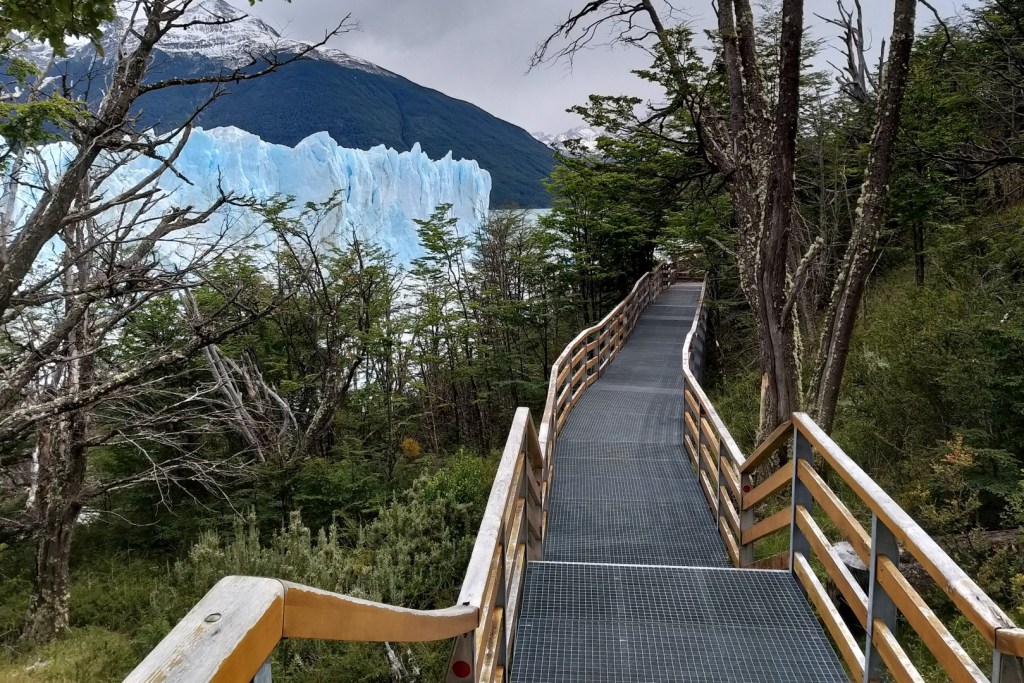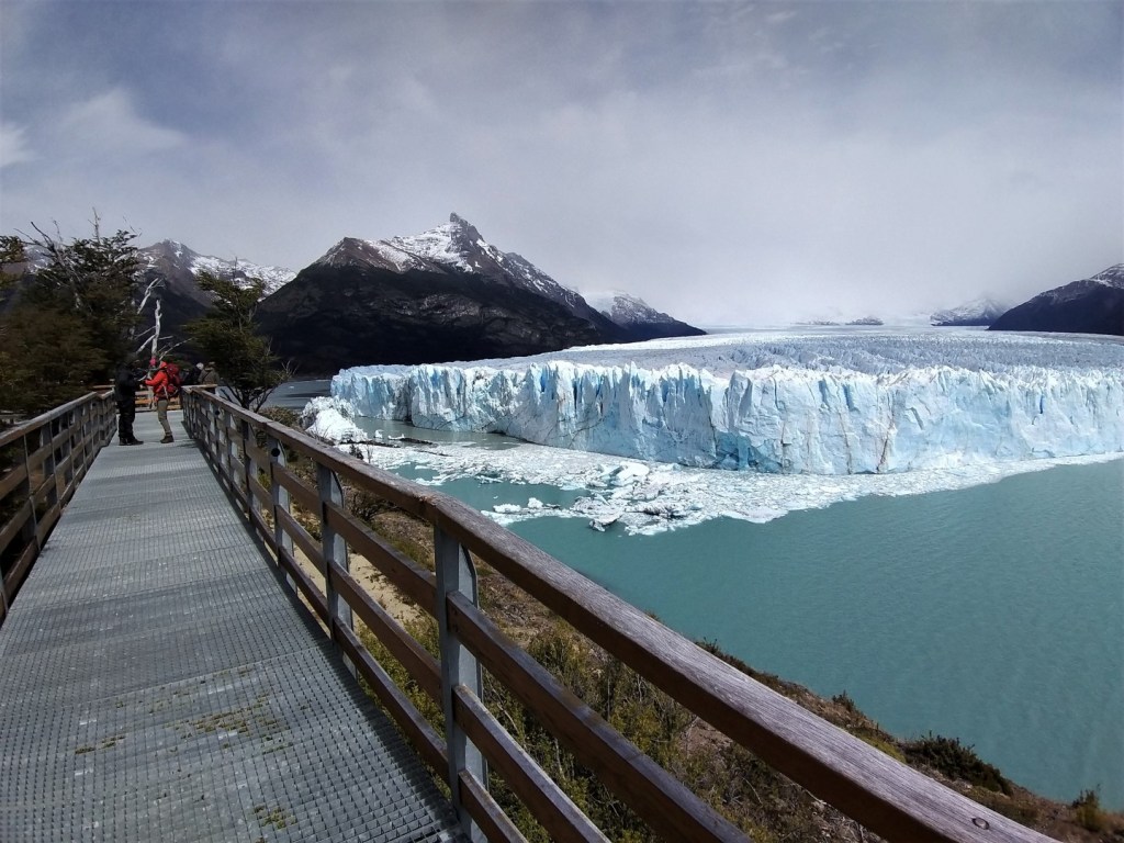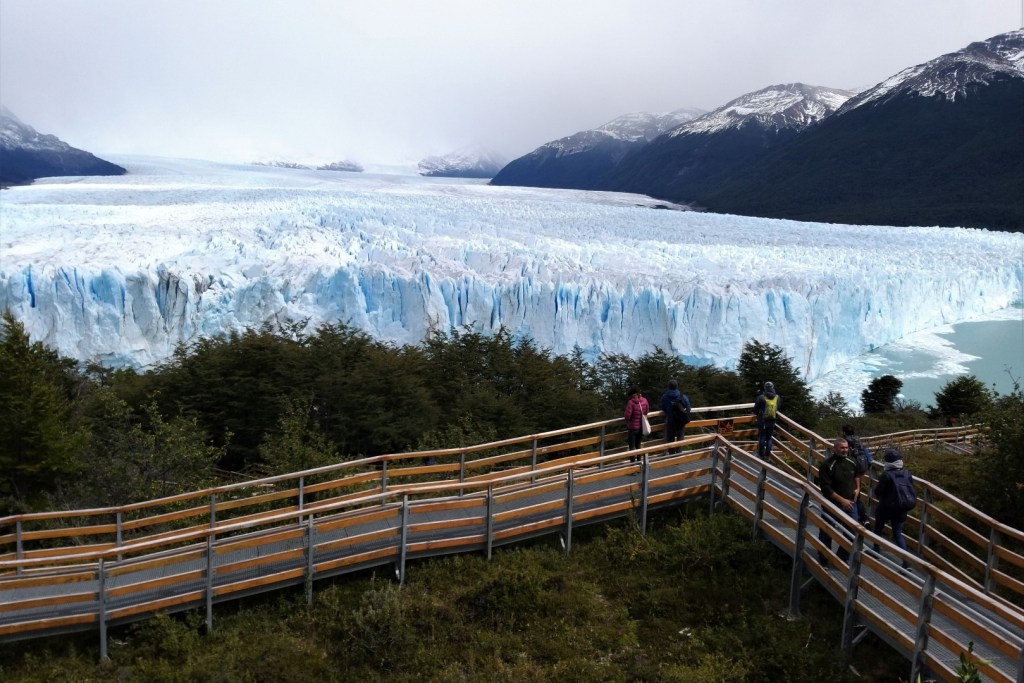 De parking, het bezoekerscentrum en het daarbij horende restaurant liggen best een eindje van de gletsjer. Van hieruit gaat de tocht verder via stalen wandelbruggen. Er komen wel wat trappen aan te pas, maar met zulke adembenemende uitzichten is dat echt geen probleem. De besneeuwde bergtoppen en het helderblauwe Lago Argentino zijn niets minder dan oogstrelend, maar de aandacht wordt toch vooral opgeëist door een enorme muur van ijs. Wanneer ik plots oog in oog sta met een van de meest surrealistische natuurfenomen van Zuid-Amerika, is dat een moment om stil van te worden.