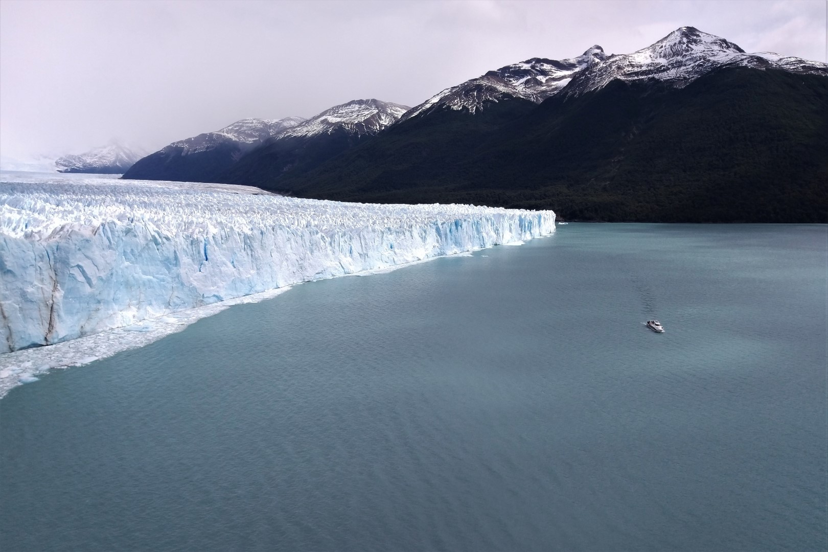 Het is niet zo eenvoudig om de omvang van het geheel te vatten, maar ik kan je vertellen dat de deze ijsmuur ongeveer zeventig meter hoog is. Da’s dus min of meer even hoog als Silver Star in Europa-Park. En nu we toch aan het vergelijken zijn: de boot op dit plaatje heeft zowat honderd toeristen aan boord. Dat schuitje is dus een pak groter dan je denkt. Als we het cijfermateriaal erbij nemen, kan je alleen maar concluderen dat Perito Moreno larger than life is. De gletsjer is vijf kilometer breed, dertig kilometer lang en als het op zoetwaterreserves aan komt, doen enkel de ijskappen van Antarctica en Groenland het beter.