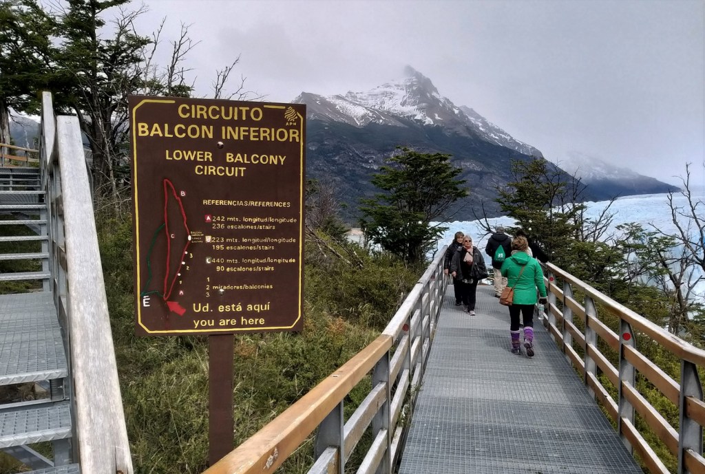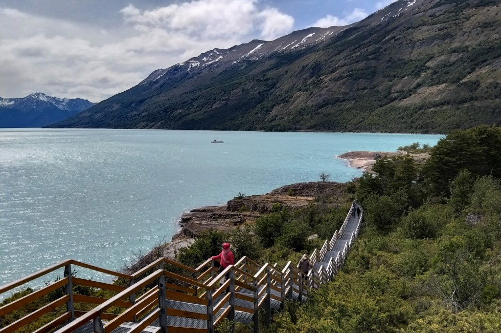Ik vertelde je eerder dat we onze wandelschoenen vandaag tevoorschijn toverden, maar of dat echt noodzakelijk was? Neen, dat niet. Je gaat immers nergens off-road: het hele wandelpad is opgebouwd uit deze comfortabele stalen bruggen, die via trappen naar de verschillende uitkijkplatformen leiden. Wandelschoenen kunnen daarentegen wel handig zijn als je op de gletsjer gaat wandelen. Deze activiteit wordt georganiseerd door verschillende reisorganisaties en halverwege krijg je blijkbaar een beker whisky met een blokje gletsjerijs. Omdat we straks de lange rit naar El Chaltén voor de boeg hebben (en we beiden liever Cointreau dan whisky drinken) beperken we ons vandaag tot de gebruikelijke wandeling.