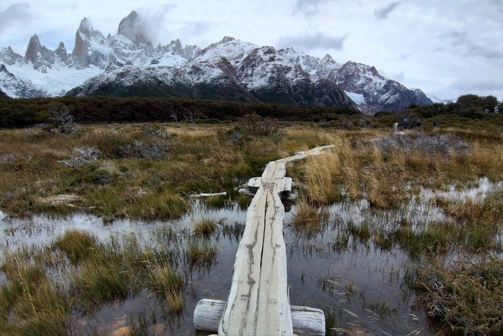 Zowel Mirador Río de las Vueltas als Mirador del Fitz Roy bekogelden ons met schitterende zichten, maar tussen die twee viewpoints viel er helaas weinig te zien. Gelukkig hebben we het minst boeiende stuk daarmee achter de rug. Vanaf dit punt is Cerro Fitz Roy haast constant in de achtergrond zichtbaar, wat het ene coole fotomoment na het andere oplevert. Met ruim zes kilometer in onze benen, bereiken we een volgende uitkijkpunt. Ik denk dat het niet officieel als een mirador wordt aangeprezen, maar ik begrijp best waarom vele mede-hikers hier even uitblazen. Granolareep nummer twee dan maar?
