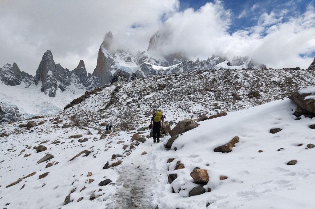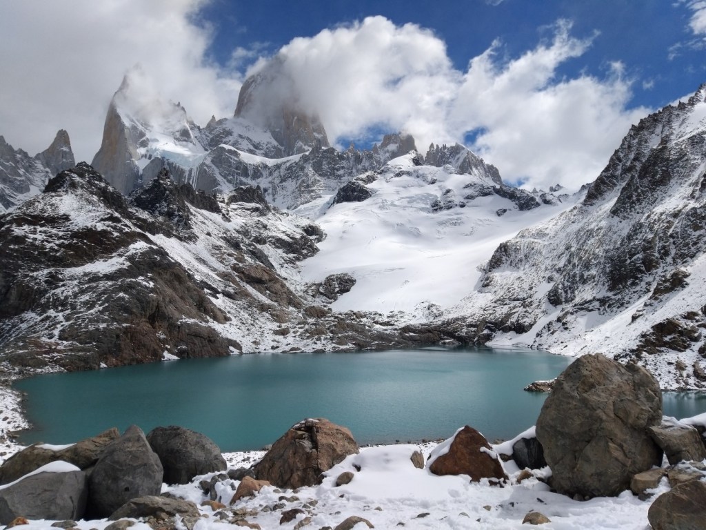 We ploeteren door een steeds dikker wordende sneeuwlaag. Het is bovendien verraderlijk glad, dus we moeten soms letterlijk op handen en voeten naar boven kruipen. Toch lijkt dat na zo’n wandeling slechts een kleinigheidje, want bovenaan de heuvel zien we Laguna De Los Tres eindelijk opdoemen. Dit kobaltblauwe meer ligt ingesloten tussen de hoogste toppen van het gebergte, met Fitz Roy als absolute blikvanger. Je moet de wolken weliswaar even wegdenken, maar het is sowieso erg indrukwekkend om dit tafereel te zien na zo’n inspannende wandeling.