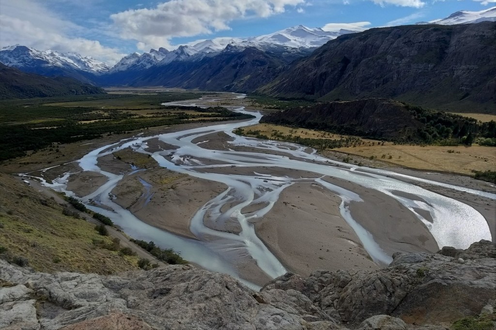 Wanneer je de eerste kilometer overleeft, is dit een haalbare trail. Oké, ik geef toe… dat is misschien een beetje kort door de bocht, maar het is een feit dat het begin van de route behoorlijk pittig is. Terwijl El Chaltén achter ons kleiner wordt, overbruggen we tijdens deze eerste kilometer al meteen een aanzienlijk hoogteverschil. Die initiële klim is intens, maar we worden ook meteen getrakteerd op een duizelingwekkend panorama. Aan de Mirador Río de las Vueltas kijken we uit over een rivierbedding die op de mooiste schilderijtjes thuis hoort. Als dit een voorproefje is voor al het natuurschoon dat we vandaag zullen zien, komt het zonder twijfel goed.