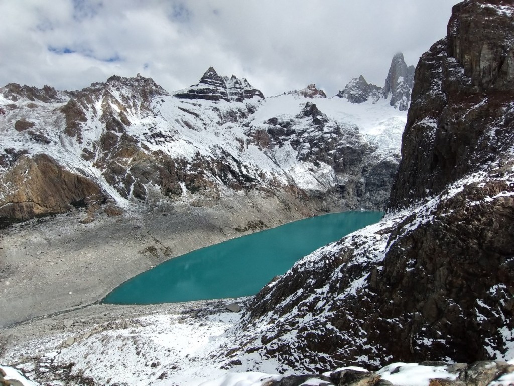 Het is omwille van de gladde sneeuwlaag niet evident om af te dalen naar de oever van Laguna De Los Tres, maar moeilijk gaat ook. Ik raak er vlug het ijskoude water aan en bewonder nadien de minstens even imposante Laguna Sucia, die enkele tientallen meters verderop ligt. Ook dit meer is knalblauw en het wordt gevoed door de Rio Blanco gletsjer. Hoewel Laguna Sucia qua naambekendheid zwaar onder doet voor z’n buurman, is ook dit een ware schoonheid.