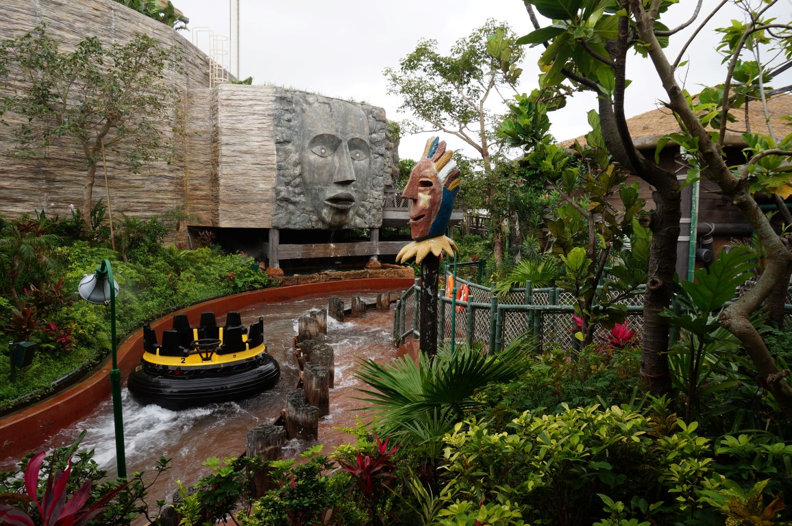 The Rapids meandert door een exotisch vormgegeven landschap en het daarboven kronkelende wandelpad levert knappe uitzichten. Van op dat wandelpad kan je met (gratis) waterpistolen naar de inzittenden richten en da’s meteen de grootste bron van natheid bij deze attractie. De eigenlijke rivier is namelijk tam, de golven zijn beperkt en zelfs de afsluitende afdaling levert weinig kansen op een nat pak. Dat kan tijdens de hete zomers van Hong Kong een teleurstelling zijn, maar vandaag ben ik blij dat we niet doorweekt uitstappen. Hoe dan ook een prima familieattractie en een oogstrelend pareltje, deze rapid river.