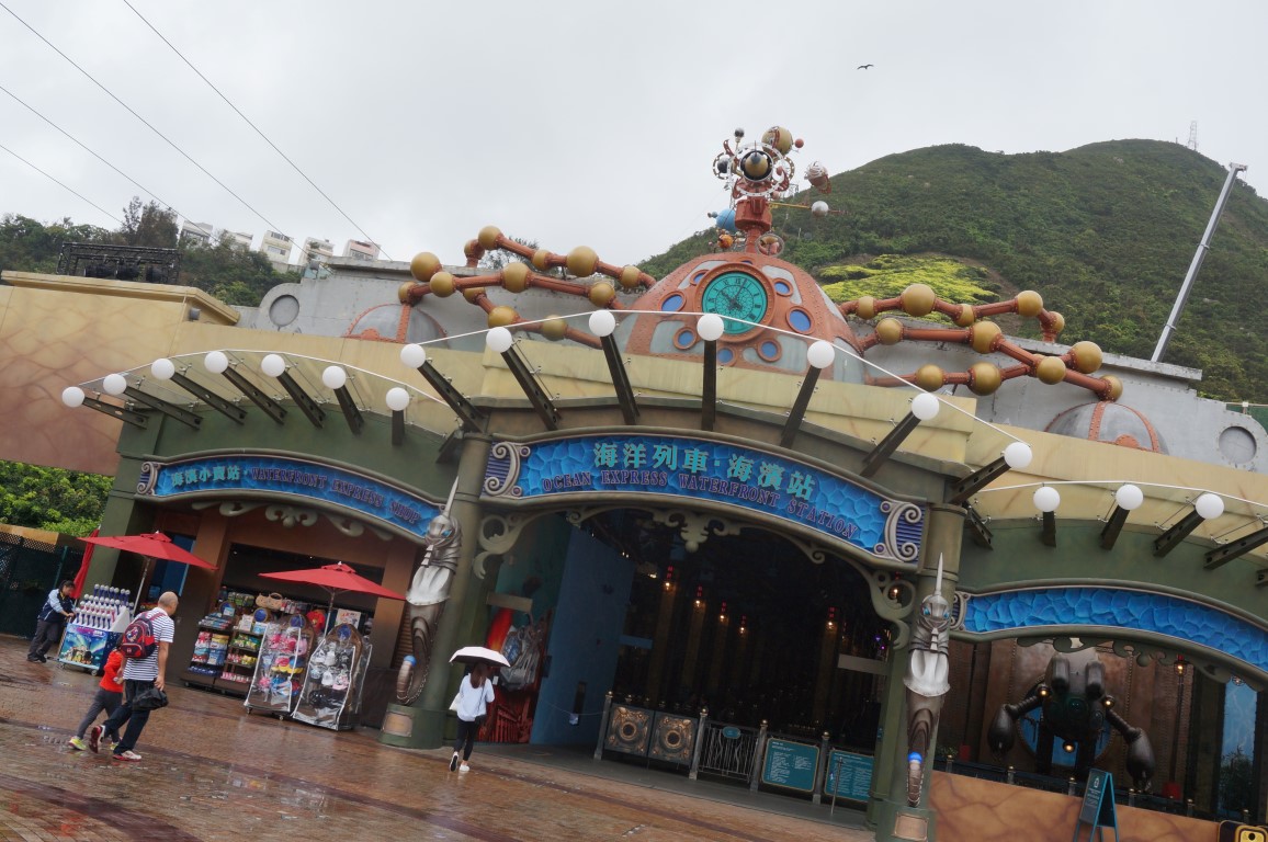 De Vloek Van Ocean Park blijft ook in 2019 bestaan, maar goed… we zijn op vakantie. En als we de natte schoenen en het geknoei met paraplu’s buiten beschouwing laten, hoeft zo’n regendag heus geen horror te betekenen. Laat ons dus vooral ontdekken wat er hier allemaal te beleven valt. En dat brengt me meteen bij een unieke eigenschap van dit park: Ocean Park bestaat uit twee aparte gedeelten. Die liggen een heel eind uit elkaar en je kan de afstand niet te voet overbruggen. Tussen The Waterfront (het parkgedeelte aan de ingang) en The Summit (de verderop gelegen zone) werden daarom twee reusachtige vervoerssystemen aangelegd. Dat zijn een antieke kabelbaan enerzijds en de Ocean Express anderzijds. Onze keuze voor vanochtend valt op die tweede optie. Deze funicular boort zich dwars door de heuvels van Ocean Park en werd in een Jules Verne-achtige stijl gethematiseerd. Dankzij een waanzinnige capaciteit en de korte ritduur is dit zonder twijfel de snelste manier om jezelf binnen Ocean Park te verplaatsen.