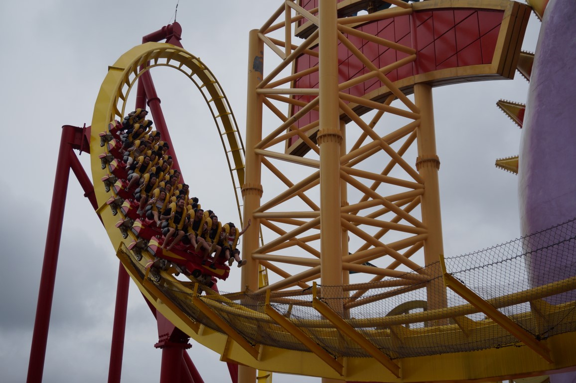 De show was matig, maar het uitzicht vanuit het Ocean Theatre mocht er zijn. Van op de tribune keken we immers uit op Dragon, een multilooper die door Arrow Dynamics geleverd werd. Dragon is een van de vaakst voorkomende namen in de pretparkwereld, al gaat het meestal over kinderachtbanen. Dat is Dragon niet: hij is ruim 800 meter lang, hij bevat drie inversies en de wondermooie locatie maakt ‘m haast even iconisch als Wild West Mine Train. Toch is niet elk aspect van deze ride even briljant. Ten eerste is de kleurstelling bedenkelijk. Ik kan felle kleurtjes heus wel appreciëren, maar overdrijven is ook een kunst. Met z’n combinatie van lila, geel en groen lijkt het alsof men de verf besteld heeft tijdens een dronken personeelsfeestje. Toch is dat eigenlijk nog het minst erge, want de ritervaring is zo mogelijk nog ellendiger. Er zitten knikken in de baan die pijnlijker aanvoelen dan een vroege wekker op maandagochtend. Ik kan me voorstellen dat Dragon tijdens de jaren ’80 een heus succesnummer was, maar vijfendertig jaar later lijkt hij op. Er mag snel een vervanger besteld worden.