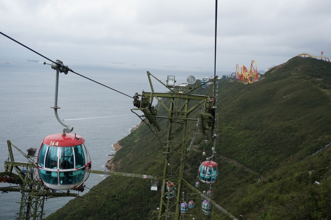 Over Hair Raiser zijn onze meningen verdeeld. Ik vind ‘m hooguit matig, maar Niek is fan en bij Carrie overheerst (naar goede gewoonte) het meh-gevoel. Over de volgende attractie zijn we het echter volkomen eens: de Ocean Park Cable Car is vreselijk cool en vreselijk angstaanjagend tegelijkertijd. Deze kabelbaan is het fotogenieke alternatief voor de Ocean Express en transporteert ons ‘s namiddags opnieuw richting The Waterfront. Het zijn acht spannende minuten: de gondels zien er gammel uit en de harde wind giert door de kiertjes van de ramen. Da’s een tikkeltje akelig, maar we worden wel getrakteerd op onbetaalbare views. Hair Raiser is op z’n mooist vanuit de Cable Car en de finale daling naar The Waterfront is niets minder dan spectaculair. Sla deze unieke ride dus beslist niet over. Instappen op The Summit lijkt trouwens een aanrader, want de wachttijden zijn daar doorgaans een stuk korter.