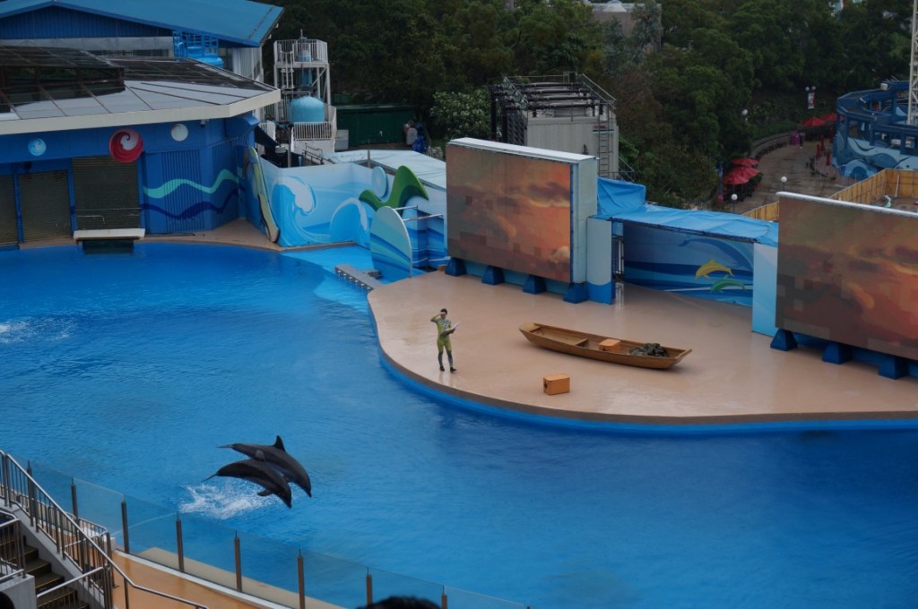 Zo lang het waterpark in aanbouw is, blijkt deze westelijke bergflank een doodse plek. De Mine Train draait voor een beperkt publiek en ook de verderop gelegen boomstammenbaan trekt vanochtend bitter weinig volk. Carrie en Niek wagen een ritje, maar ik wil het risico op een nat pak vermijden. Blijkbaar ben ik niet de enige die bang is van het water, want ook de hoofdrolspelers van parkshow Ocean Wonders houden het halverwege voor bekeken. Pittig detail: die hoofdrolspelers zijn dolfijnen. Wij vinden het dus op z’n zachtst gezegd bijzonder dat hun show noodgedwongen ingekort wordt omwille van de weersomstandigheden. Is men bang dat de dolfijnen een verkoudheid krijgen als ze in de regen optreden? Gaan zulke dieren in staking wanneer ze nat worden? Geen idee, maar we druipen (pun intended) beteuterd af.