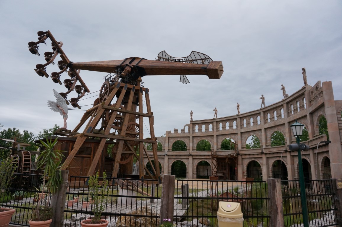 Het meest interessante themadeel van Familypark is in mijn ogen het zogenaamde Abenteuerinsel. Deze zone is opgetrokken in een mediterrane stijl en bevat de meeste grote attracties. Je vindt er onder andere een waterspeelplaats, een waterglijbaan met rubberbootjes, een schommelschip en een van de allermooiste flat rides in Europa. Het ding heet Leonardos Flugmaschine en dat is een Sky Fly van Gerstlauer. Je kent deze vliegtuigmolen misschien uit Duinrell of Nigloland. Daar zorgt ie telkens voor vele kijklustigen en je kan de rit net zo intens maken als je zelf wil. Toch moet gezegd worden dat die drie attracties allesbehalve uitzonderlijk gedecoreerd werden. Familypark levert het bewijs dat het anders kan, want Leonardos Flugmachine is een oogstrelend plaatje. Hij zou perfect in het Italiaanse themagebied van Europa-Park passen en zelfs in de Venetiaanse zone van Tokyo DisneySea zou deze molen niet misstaan. Een gewaagde uitspraak, dat weet ik best, maar toch… kijk zelf eens wat een schoonheid het is.
