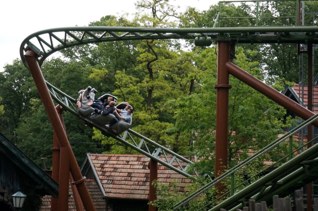 De twee andere coasters zijn gelukkig interessanter. En dat geldt zowel voor de ritervaring als voor het thema. Een van die banen is Rattenmühle, een Bobsled Coaster van Gerstlauer. Schrik vooral niet: dit type heeft niks met bobsleeën te maken. Het is gewoon een gek gekozen naam voor een deluxe-versie van de Wild Mouse. Ondanks die tegenstrijdige naam is dit wel een van de leukste achtbaanvarianten van Gerstlauer. Deze rides kenmerken zich door een soepel baanverloop, een bochtige lay-out en veel pret op ‘n beperkte oppervlakte. Rattenmühle voldoet aan al deze voorwaarden en het is dus een prima rollercoaster. Verder is de baan prachtig geïntegreerd in een bosrijk gebied en werd er een oogstrelend stationnetje opgetrokken. Knap werk.