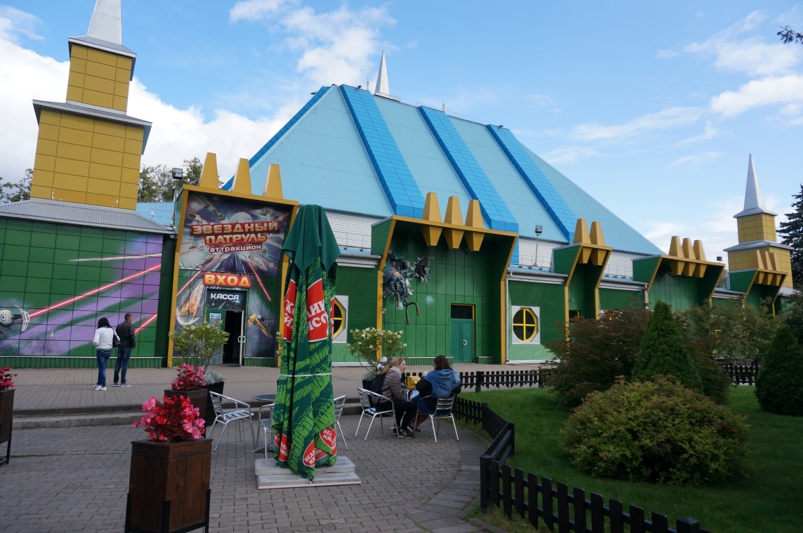 Tien keer overkop met een Intamin kost 300 roebel (ongeveer 4,20 euro) en als je vooraan wil plaatsnemen, moet je nog 50 roebel extra dokken. Dat is behoorlijk prijzig naar Russische normen, maar jonge bezoekers komen gelukkig goedkoper aan hun trekken. In een uitgebreide kinderzone staat de ene familiale attractie naast de andere en de sfeer is er best gezellig. Natuurlijk laat ik die kinderlijke rondritjes en glijbanen aan me voorbij gaan, maar één specifieke attractie in dit gebied trekt mijn aandacht. Dat is de zogenaamde Alien Dark Ride, die in een reusachtige blauwe koepel te vinden is. Het gebouw lijkt enorm, maar wordt helaas gedeeltelijk gebruikt voor een schreeuwerige arcadehal. Toch kan de eigenlijke attractie me wel bekoren. Dit is een interactieve dark ride met laserguns en draaiende karretjes (net zoals Discovery Club in Avonturenpark Hellendoorn). Hoewel de decors overwegend statisch zijn, ziet het er allemaal prima uit. Zeker wanneer je, net zoals ik, het niveau van een derderangs Oostblok-kermis verwacht, valt het goed mee. Als liefhebber van dark rides mag je deze buitenaardse schietmissie dus niet missen.