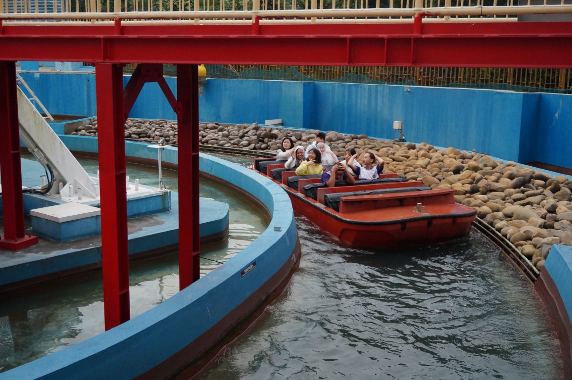 We verlaten het Trojan Castle en we wagen ons opnieuw in de zwoele buitenlucht. Het is een bewolkte namiddag, maar over de temperatuur mag ik niet klagen: het wordt vanmiddag zowat dertig graden en verkoeling is dus welkom. En wie verkoeling zegt, die zegt bootjes. Bootjes heeft E-DA Theme Park trouwens in alle vormen en maten. Je kan voor het klassieke pretparkvermaak gaan in een schommelschip of je kan opteren voor een vaartocht in de Splash Battle.