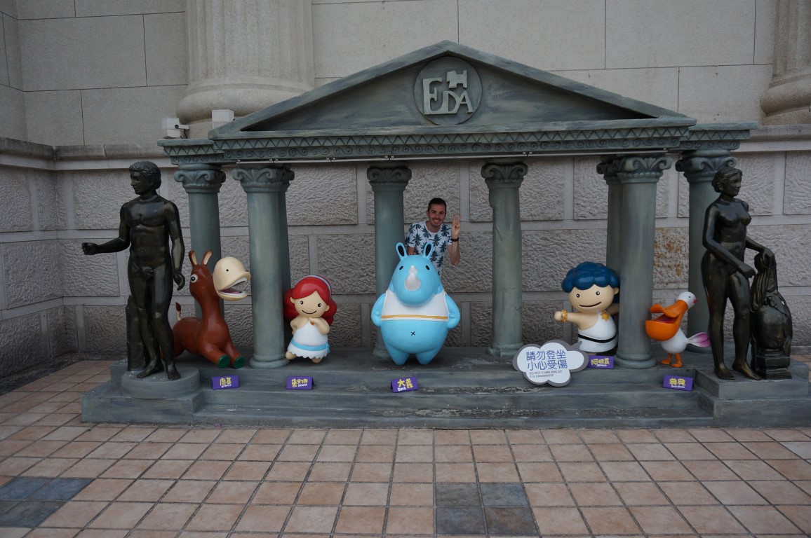 E-DA World is bij ons in Europa niet bekend, maar voor Taiwanezen is dit een geliefde bestemming. Ze komen logeren in het luxueuze E-DA Royal Hotel, ze gaan naar de film in de E-DA Cinema, ze genieten van een show in het E-DA Royal Theater en ze spenderen hun dollars in de E-DA Outlet Mall. Dit reusachtige shopping center vormt het hart van het resort en het verbindt alle andere onderdelen met elkaar. Alsof dat nog niet genoeg is, plaatste men een gigantisch reuzenrad op het dak van de mall en werd er wat Vegas-achtige decoratie voorzien. Wat Lotte World in Zuid-Korea is, dat is E-DA World hier in Taiwan: een entertainmentgigant die voor iedereen wel iets te bieden heeft. Wij lunchen in de food court van het winkelcentrum en maken ‘s avonds een rondje op het reuzenrad. De hoofdreden voor ons bezoek is E-DA Theme Park, een Grieks gethematiseerd pretpark.