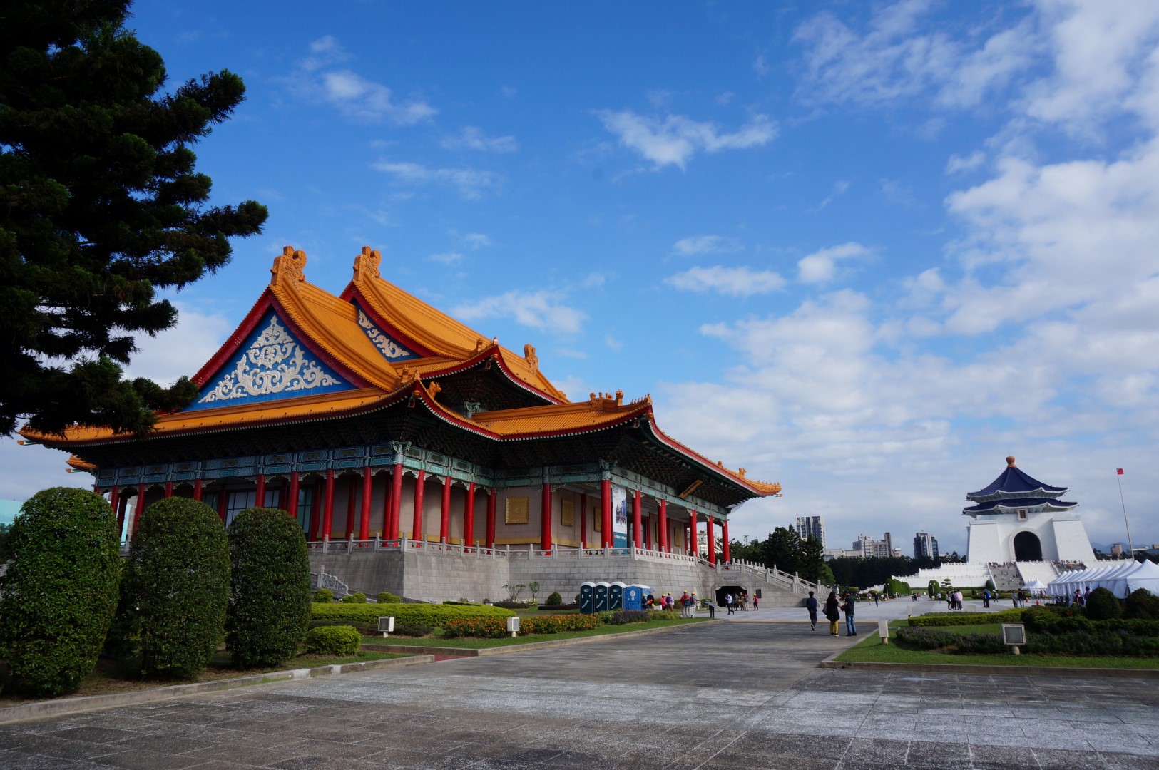 Laat ons over gaan naar een van de architectonische paradepaardjes van Taipei. Middenin het zakelijke centrum, omzoomd door brede boulevards, ligt de Chiang Kai-shek Memorial Hall. Dit enorme monument werd opgetrokken ter ere van de eerste President van de Republiek China. Het is een gigantisch park met meerdere gebouwen, piekfijn gesnoeide hagen en een schitterende Aziatische tuin.