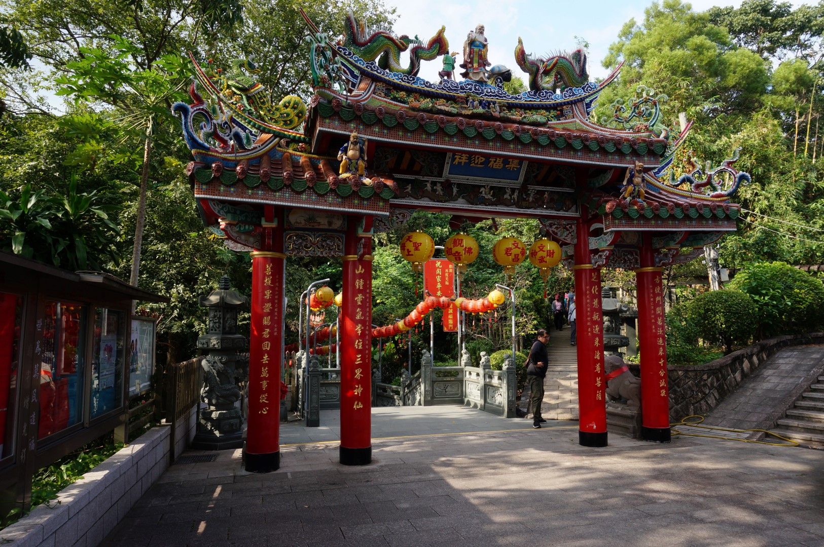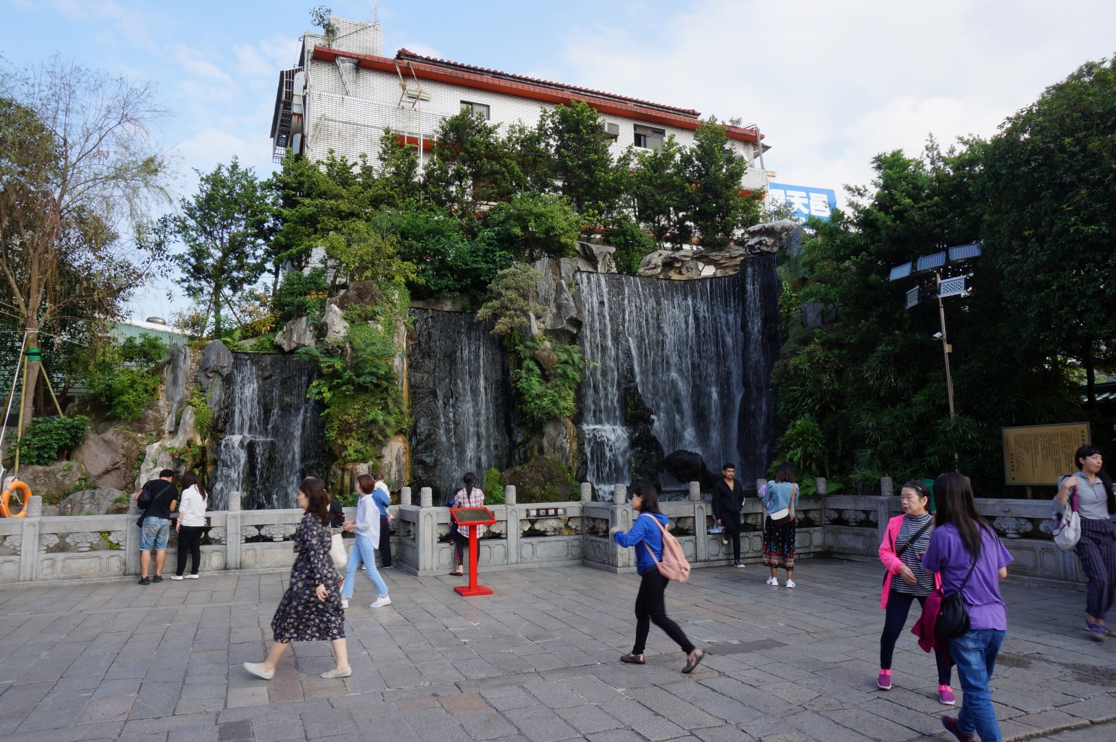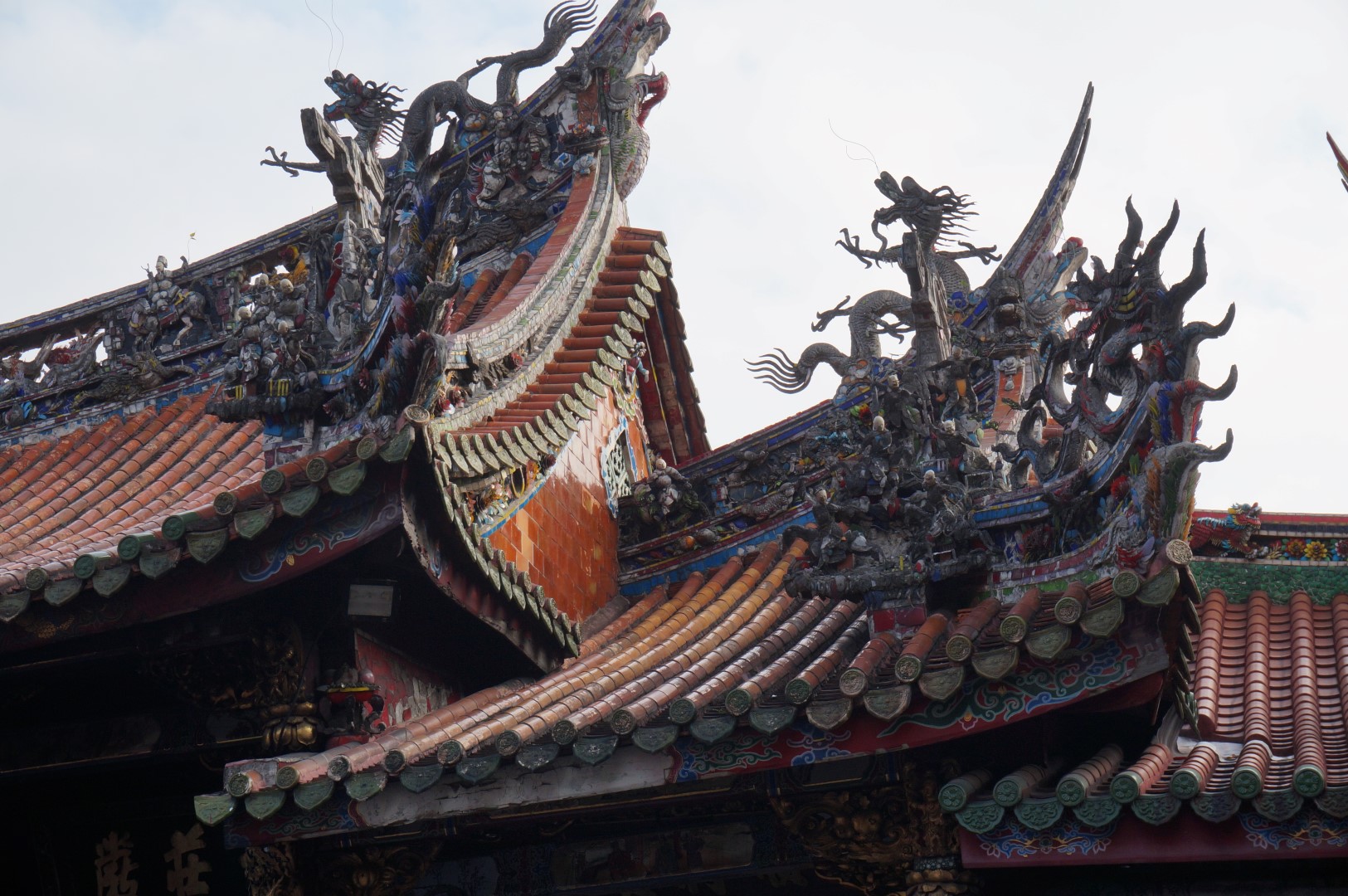 Als toerist ben je vooral geïnteresseerd in de schoonheid van zo’n tempel, is het niet? Op dit vlak scoort de Longshan Temple alvast prima, want het is een juweeltje. Net zoals dat bij de meeste Taiwanese tempels het geval is, zijn de randen van het dak rijkelijk versierd met drakenbeelden en kleurrijke ornamenten. Het oogt allemaal wat pompeuzer – mag ik het zelfs kitscherig noemen? – dan de tempels die we in Japan en China zagen, al beschouw ik dat niet als een negatief punt. Wel integendeel: de Longshan Temple is ronduit schitterend. Er werd zelfs een oogstrelende waterval naast het complex gebouwd, om het Instagram-waardige karakter nog extra te benadrukken.