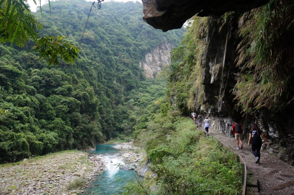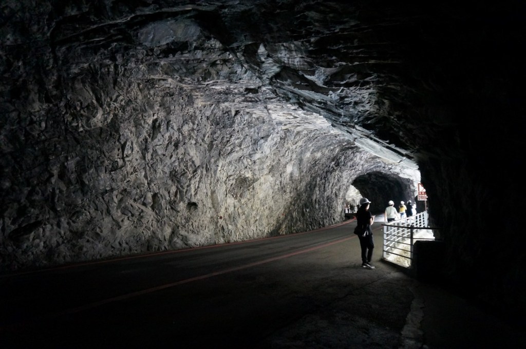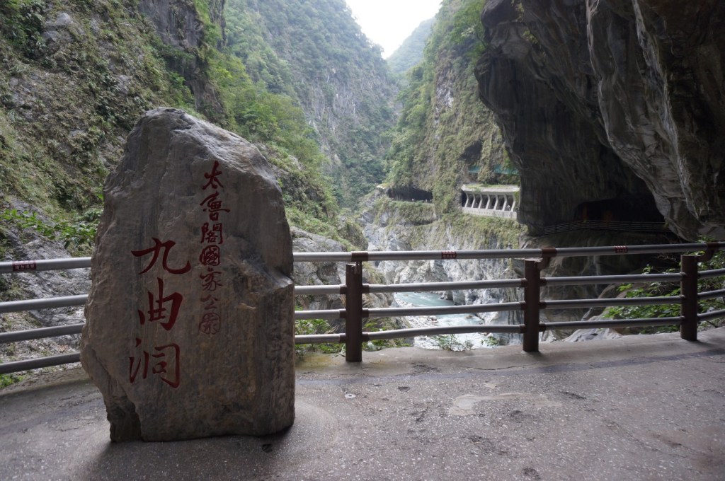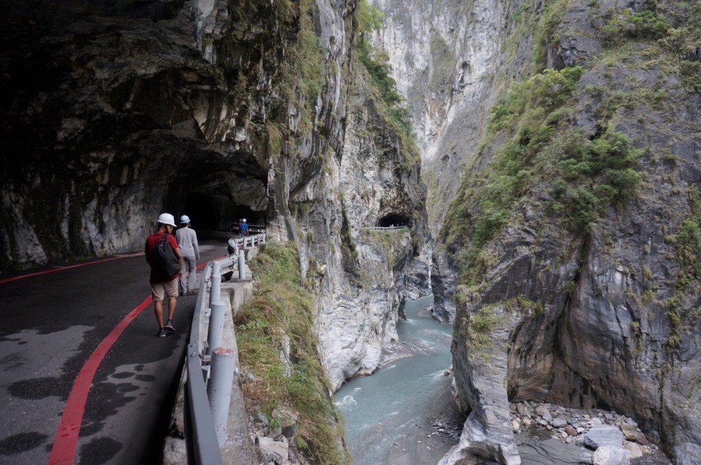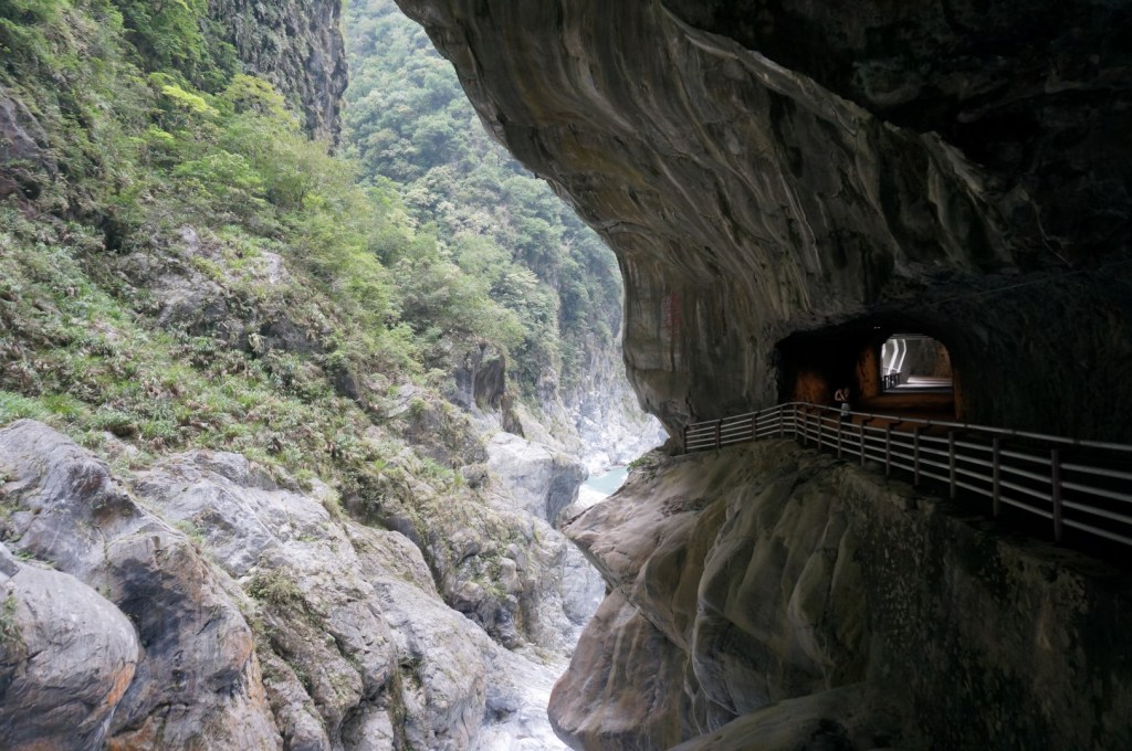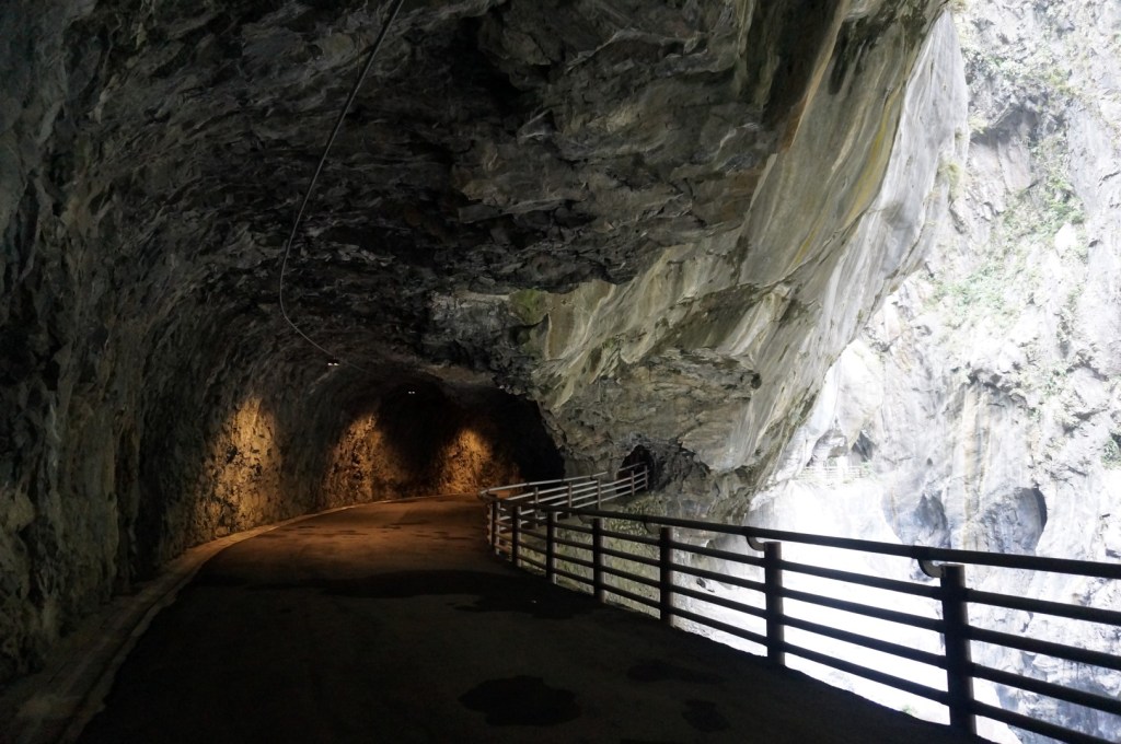 Het landschap is (nogmaals) gelijkaardig: we zien een rivier, steile kliffen en het indrukwekkende lijnenspel van de rotsformaties. Na onze bezoekjes aan de Shakadang Trail en Swallow Grotto wordt dit stilaan usual stuff, maar toch is de Tunnel of Nine Turns erg imposant dankzij z’n hedendaagse architectuur. Deze tunnel was ooit onderdeel van een autoroute dwars door Taroko National Park. Door de aanleg van een nieuwe autoroute werd deze weg echter overbodig en werd hij omgebouwd tot een wandeltrail. Dat verklaar de hoge gewelven en de breedte van het pad.