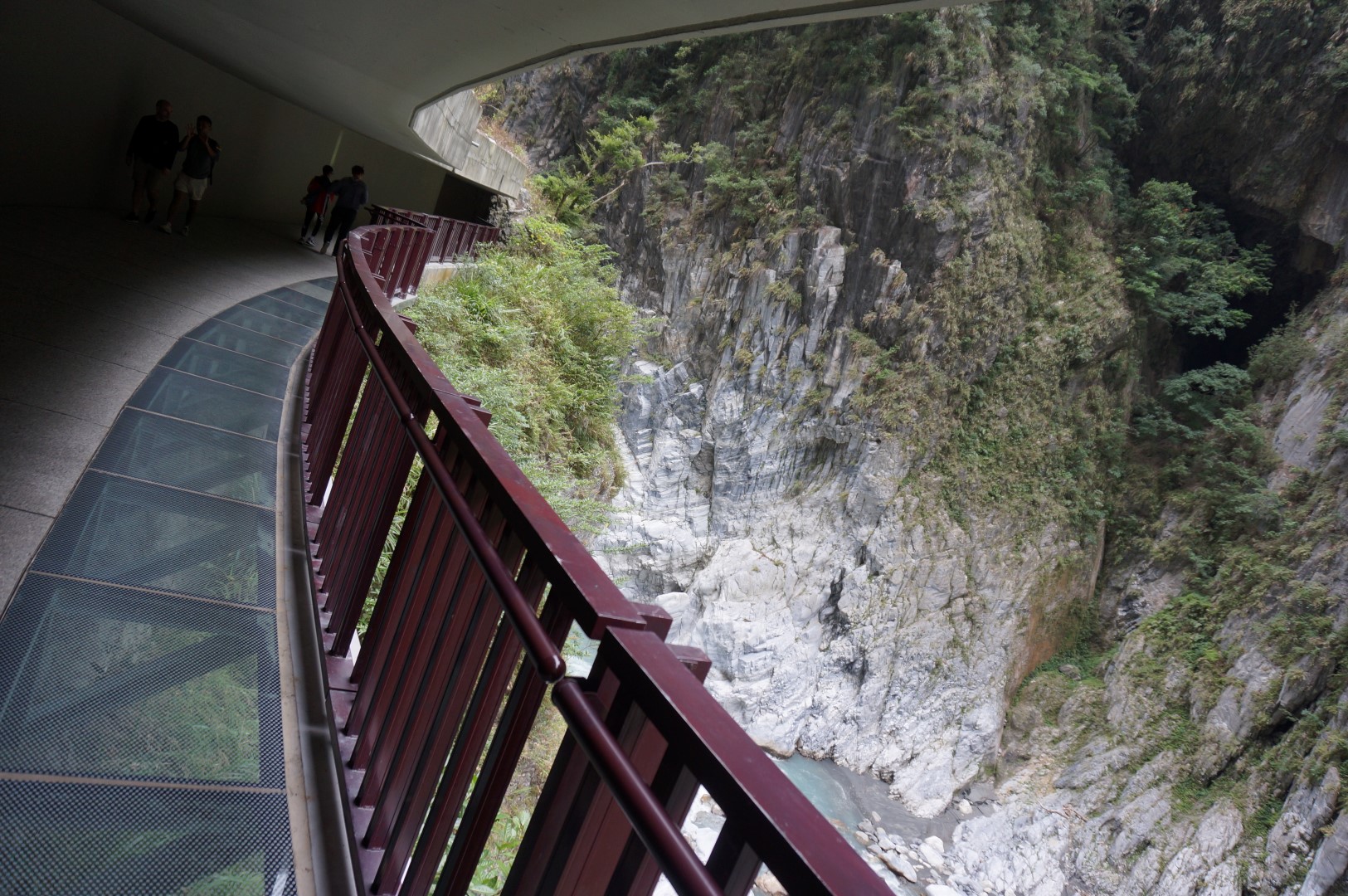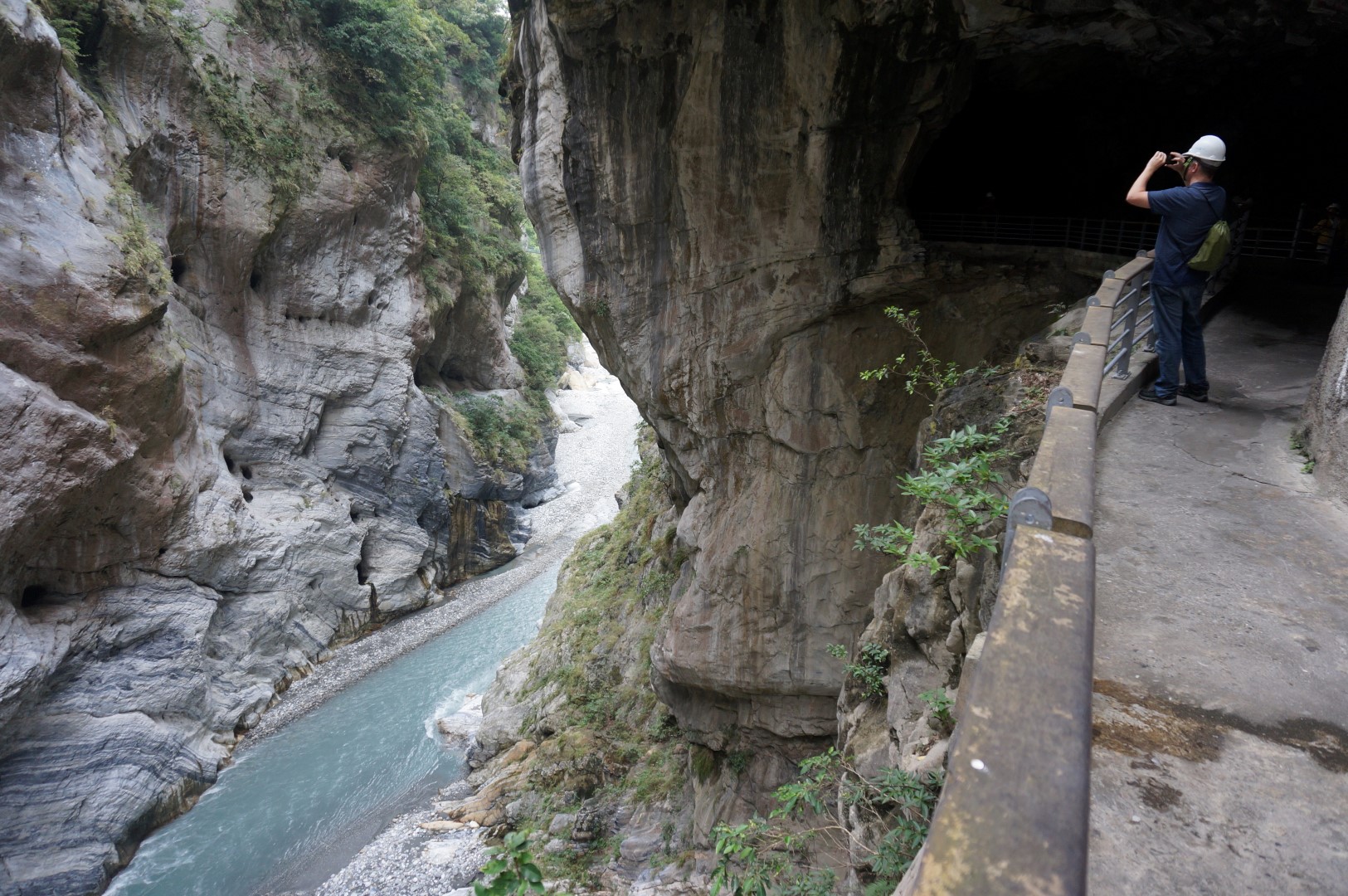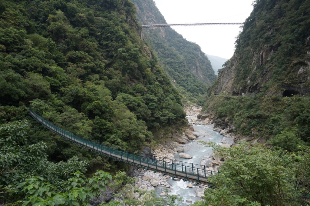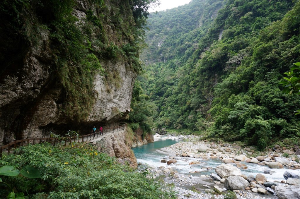 Het landschap is (nogmaals) gelijkaardig: we zien een rivier, steile kliffen en het indrukwekkende lijnenspel van de rotsformaties. Na onze bezoekjes aan de Shakadang Trail en Swallow Grotto wordt dit stilaan usual stuff, maar toch is de Tunnel of Nine Turns erg imposant dankzij z’n hedendaagse architectuur. Deze tunnel was ooit onderdeel van een autoroute dwars door Taroko National Park. Door de aanleg van een nieuwe autoroute werd deze weg echter overbodig en werd hij omgebouwd tot een wandeltrail. Dat verklaar de hoge gewelven en de breedte van het pad.
