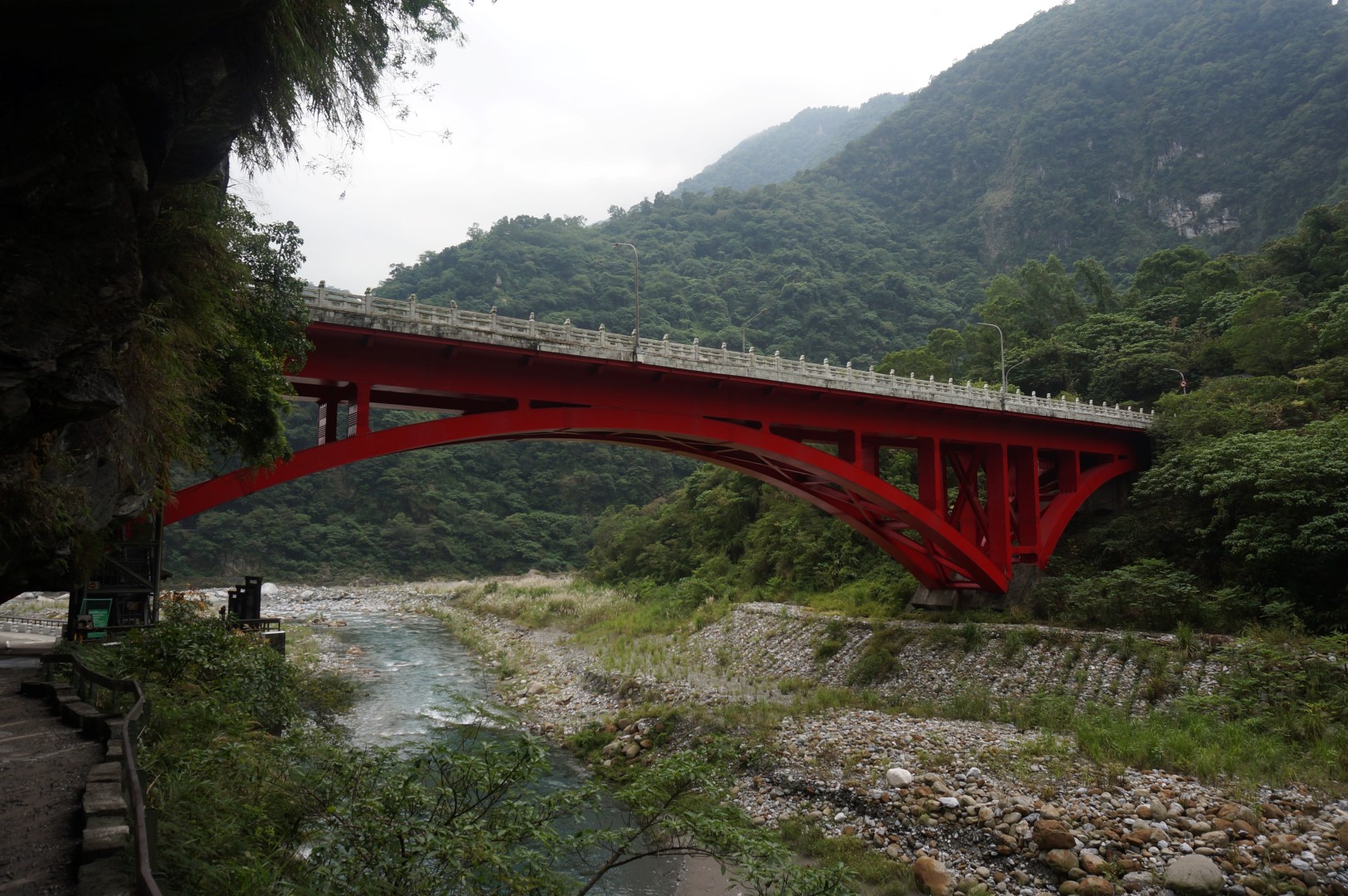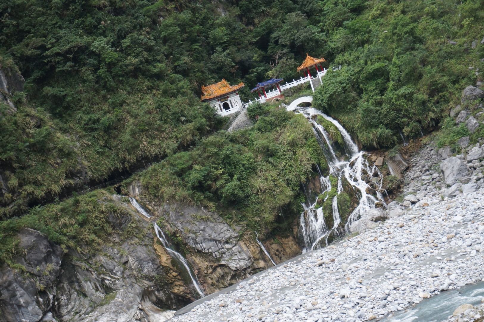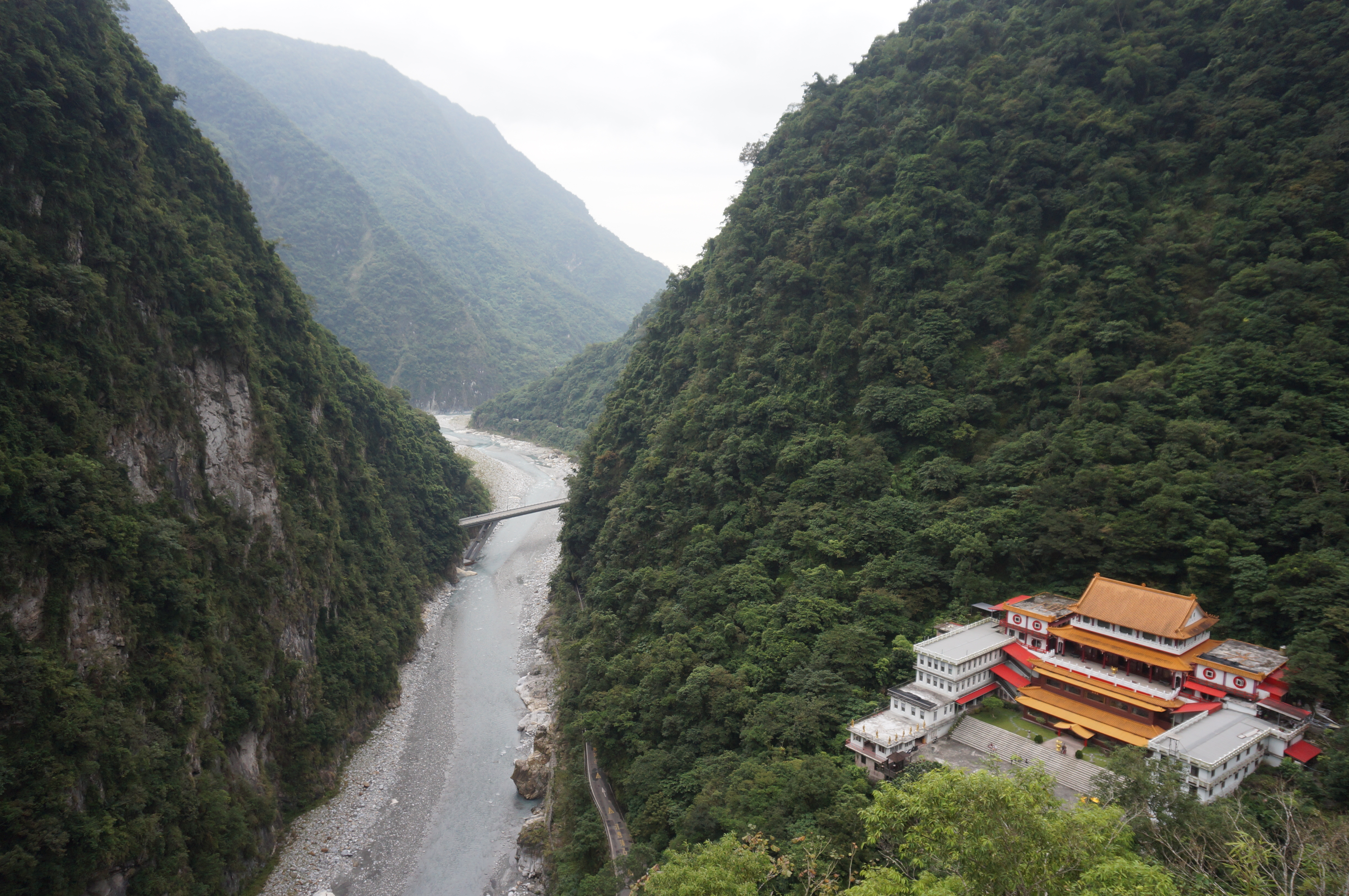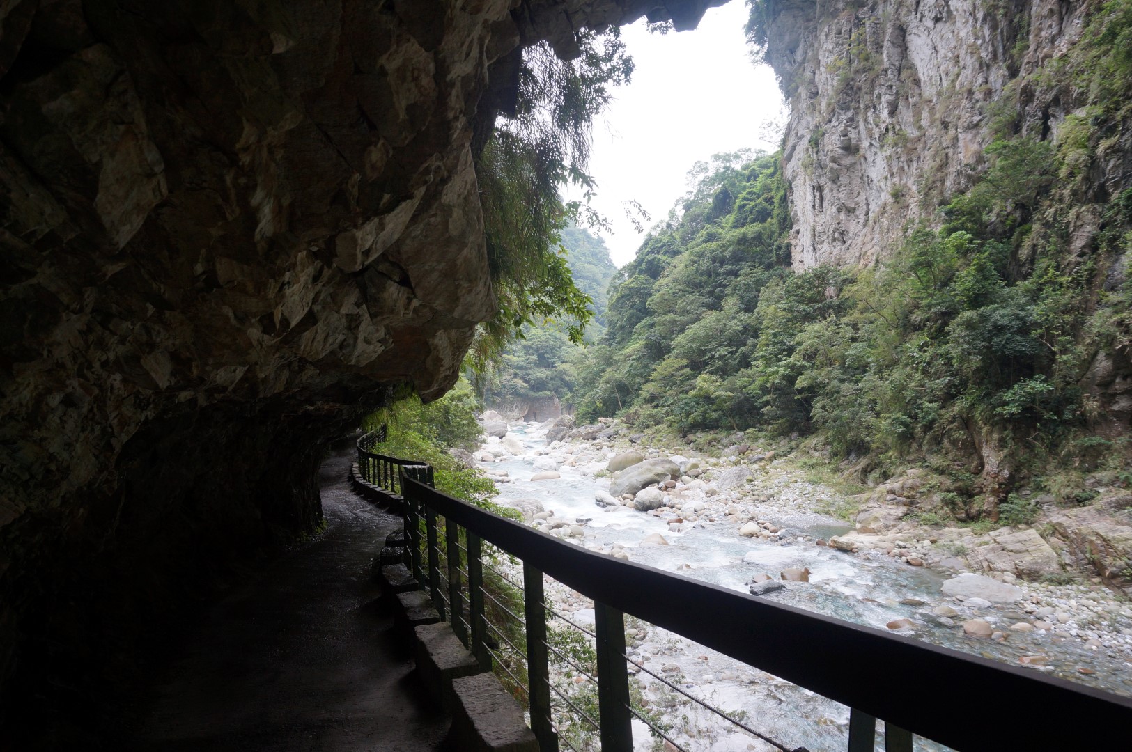 Het landschap is (nogmaals) gelijkaardig: we zien een rivier, steile kliffen en het indrukwekkende lijnenspel van de rotsformaties. Na onze bezoekjes aan de Shakadang Trail en Swallow Grotto wordt dit stilaan usual stuff, maar toch is de Tunnel of Nine Turns erg imposant dankzij z’n hedendaagse architectuur. Deze tunnel was ooit onderdeel van een autoroute dwars door Taroko National Park. Door de aanleg van een nieuwe autoroute werd deze weg echter overbodig en werd hij omgebouwd tot een wandeltrail. Dat verklaar de hoge gewelven en de breedte van het pad.