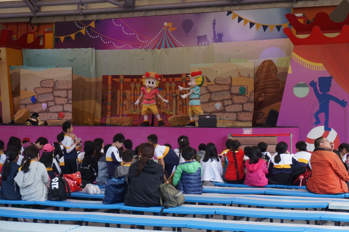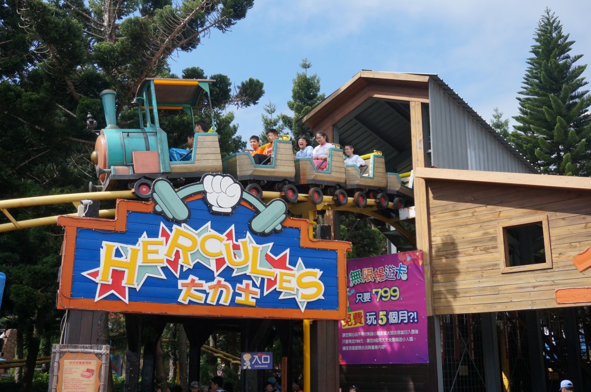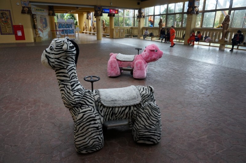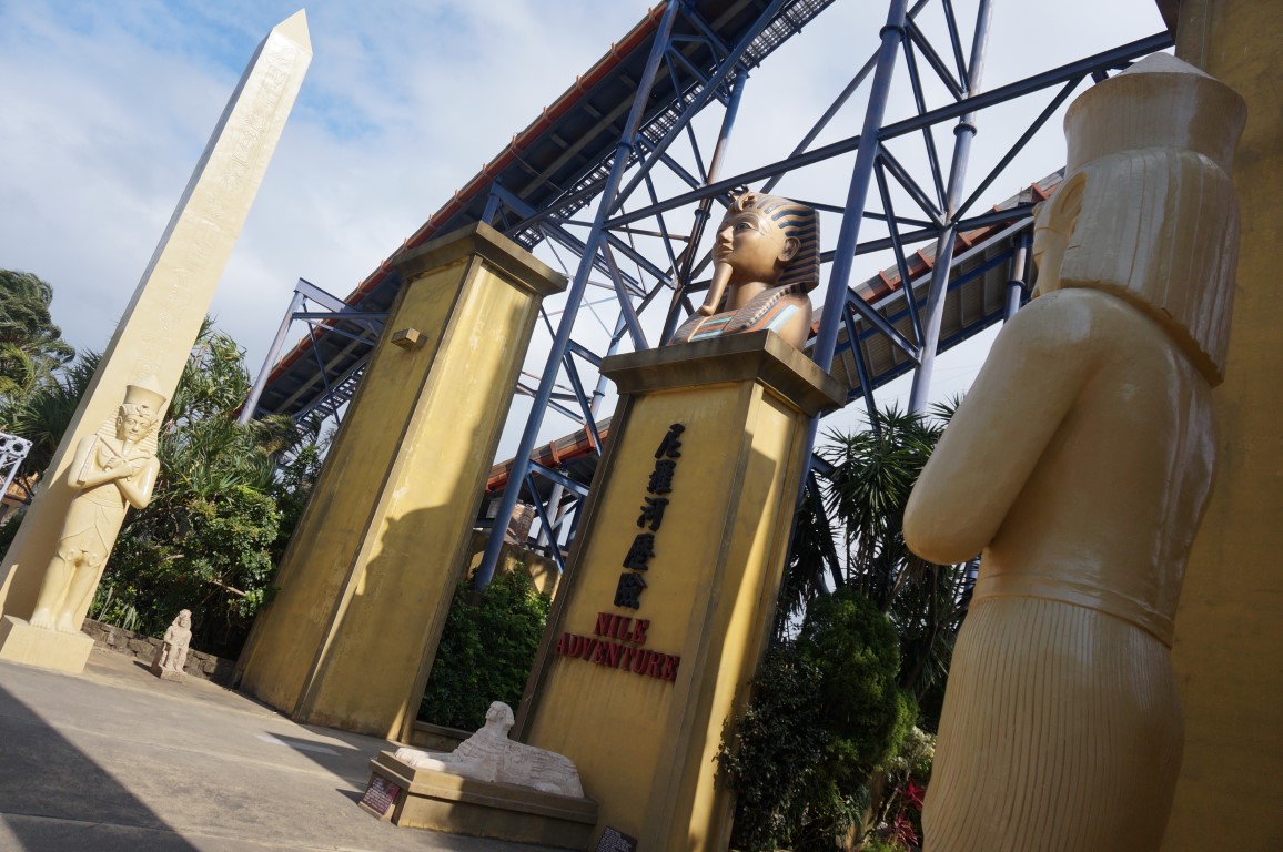 Wanneer we in het achterste parkgedeelte arriveren, worden we ondergedompeld in Egyptische sferen. Direct achter het treinstation ligt namelijk Nile Adventure, een enorme Shoot-the-Chutes. Dit attractietype bestaat over de hele wereld: Thorpe Park, Hersheypark en Happy Valley Shanghai hebben bijvoorbeeld allemaal exemplaren die qua grootte niet moeten onderdoen voor deze versie. Maar net zoals ik de attractie in het Verenigd Koninkrijk, Amerika en China oversloeg, zo pas ik ook hier in Taiwan. Er wordt slechts met één boot gewerkt en bovendien zie ik de meeste schoolkinderen totaal doorweekt uit deze Nile Adventure stappen. Natte kleren kan ik op deze miezerige ochtend best missen.