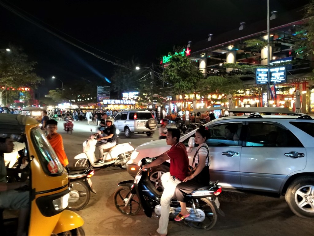 Dat hotel vormt ons eigen streepje rust in de gekte die Siem Reap is. Want geloof me… deze stad is – zoals we dat hier in Antwerpen zeggen – een zottenkot. Honderden brommertjes scheuren voorbij, auto’s nemen de verkeersregels met een korrel zout en daartussen rijden tientallen tuktuks met toeristen. Zeker tijdens onze eerste avond (we komen aan op een zondag) is het verkeer duizelingwekkend druk. Het lijkt aanvankelijk pure zelfmoord om de straat over te steken, maar we herinneren ons de tips die vele reiswebsites geven. Ze zeggen altijd dat je rustig, maar zelfverzekerd naar de overzijde van de straat moet beginnen stappen. Het naderende verkeer past zich aan naargelang jouw wandelsnelheid, dus plots versnellen of vertragen is levensgevaarlijk. Ik moet toegeven dat het trucje werkt, want we halen de overkant inderdaad telkens zonder kleerscheuren. Toch kost het best wat durf.