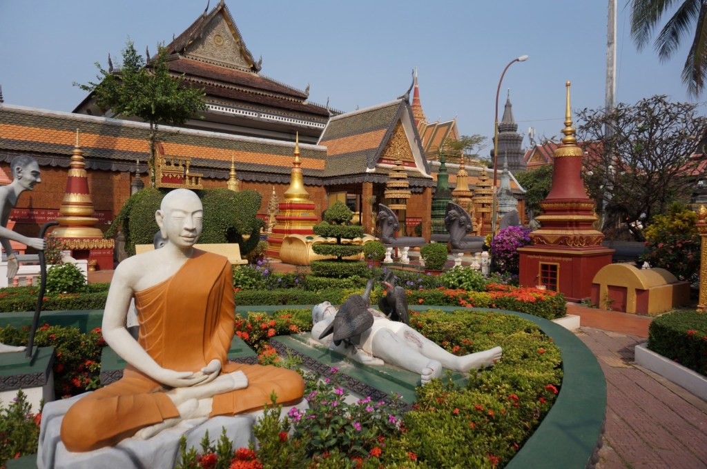 Een van die dingen is Wat Preah Prom Rath. Deze boeddhistische tempel ligt langs de oevers van de Siem Reap River en vanuit ons hotel is het hooguit vijf minuten wandelen. We springen hier dus graag even binnen en we ontdekken daardoor een prachtige plek. Wanneer je drie dagen rondom Angkor doorgebracht hebt, zou je kunnen vermoeden dat elke Cambodjaanse tempel in puin ligt. Wat Preah Prom Rath is echter nog in volle glorie te bewonderen en overtuigt vooral dankzij z’n fotogenieke voorplaats. De monniken die ter plaatse hun ding doen, dragen trouwens bij aan de unieke sfeer die hier hangt.