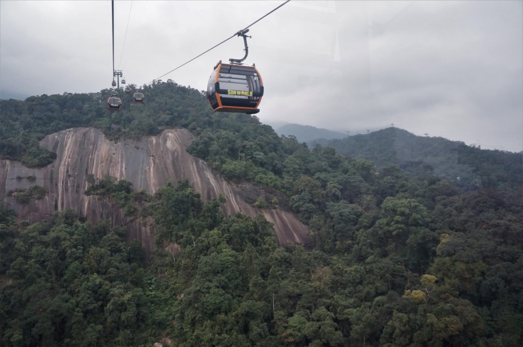 Kabelbanen zijn indrukwekkende machines. Ik heb geen ervaring met de exemplaren in skigebieden, maar ik vond de versies van Sentosa en Lantau Island erg knap. De Ba Na Hills Cable Car moet er niet voor onderdoen. De gondels zijn hypermodern, de rit duurt lang en het hoogteverschil is immens. Helaas werkt het weer niet helemaal mee. Wanneer we het eindstation naderen, belanden we immers in een forse mistbank. Onze eerste blik op de Golden Bridge – de grootste blikvanger van het hele park – is daardoor nogal triest. We hopen dat het weer tijdens de namiddag wat vrolijker wordt en we besluiten de Golden Bridge even te laten voor wat hij is. In ruil daarvoor nemen we een tweede (kortere) kabelbaan die ons naar een ander parkgedeelte transporteert.