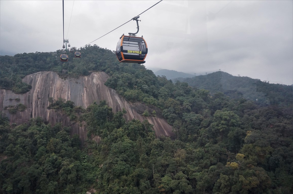 Kabelbanen zijn indrukwekkende machines. Ik heb geen ervaring met de exemplaren in skigebieden, maar ik vond de versies van Sentosa en Lantau Island erg knap. De Ba Na Hills Cable Car moet er niet voor onderdoen. De gondels zijn hypermodern, de rit duurt lang en het hoogteverschil is immens. Helaas werkt het weer niet helemaal mee. Wanneer we het eindstation naderen, belanden we immers in een forse mistbank. Onze eerste blik op de Golden Bridge – de grootste blikvanger van het hele park – is daardoor nogal triest. We hopen dat het weer tijdens de namiddag wat vrolijker wordt en we besluiten de Golden Bridge even te laten voor wat hij is. In ruil daarvoor nemen we een tweede (kortere) kabelbaan die ons naar een ander parkgedeelte transporteert.