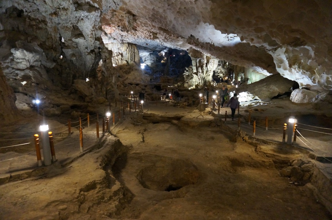 Maar net wanneer ik wil beweren dat Sung Sot een tegenvaller is, beland ik in de derde kamer. Deze heeft een oppervlakte van 10.000 vierkante meter en sommige stalactieten hangen wel dertig meter hoog. Het is een indrukwekkend schouwspel en de omvang van het geheel is moeilijk te vatten. Probeer op onderstaande foto de lampjes van het wandelpad te volgen en dan merk je pas hoe enorm deze grot eigenlijk is. De wandelroute door deze derde kamer is een halve kilometer lang en het zou stiekem een perfecte wachtrij zijn voor Journey to the Center of the Earth in Tokyo DisneySea.