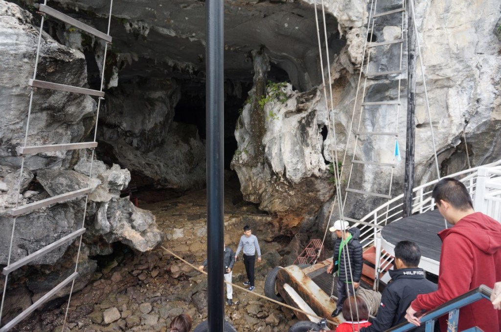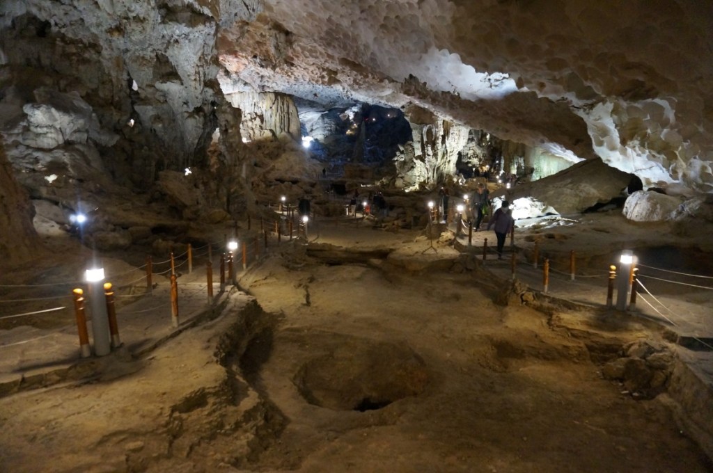 De maaltijden horen bij een cruise zoals achtbanen bij een dagje pretpark. Toch ging ik in eerste instantie aan boord om Ha Long Bay te verkennen. En ook dat gebeurt. Meermaals per dag kan je overstappen op een kleine shuttleboot die het vervoer naar de verschillende bezienswaardigheden verzorgt. Na onze buffetlunch vertrekt die ferry voor de eerste keer. Z’n bestemming is de beroemde Sung Sot Cave, wat vertaald kan worden naar iets als Verrassingsgrot. Geen Wondergrot zoals in Aladdin, maar een grot waar de Franse ontdekkers blijkbaar oprecht door verrast waren. Grotten zijn allesbehalve zeldzaam in Ha Long Bay – er zijn er bijna zestig – maar Sung Sot staat wel bekend als de grootste. Bij zo’n grote grot hoort helaas ook een grote bezoekersstroom. Zowat elke rederij stuurt er vanmiddag wel een bootje heen. Het is dus druk. Zeker in de eerste twee kamers is het dringen. En weet je wat het ergste is? Zo indrukwekkend zijn die eerste kamers helemaal niet.