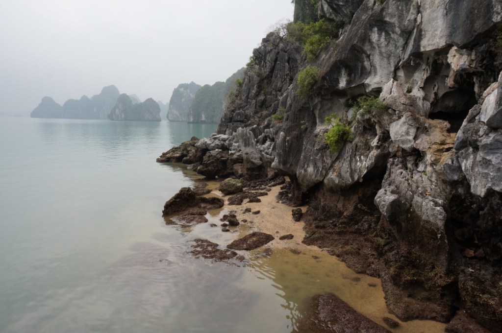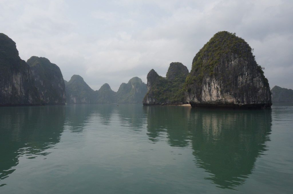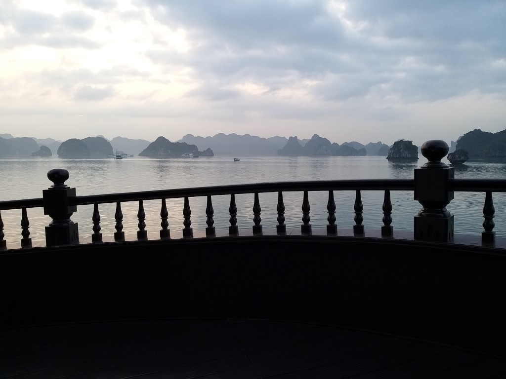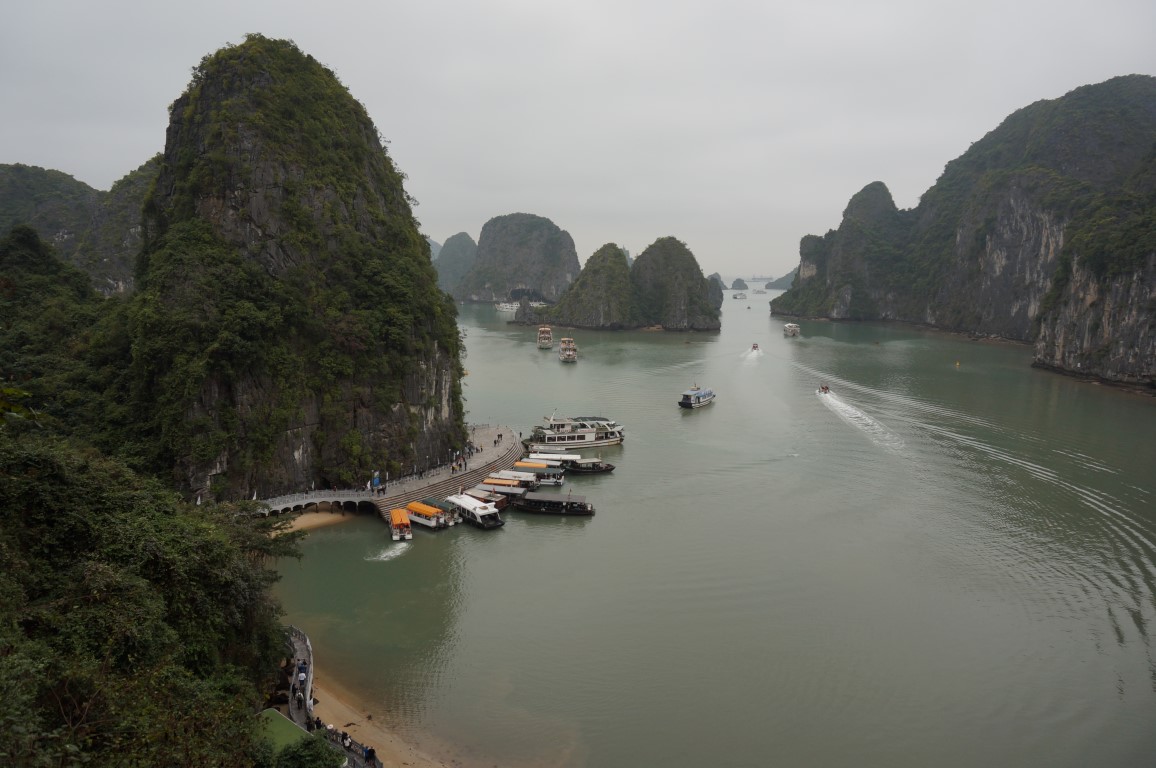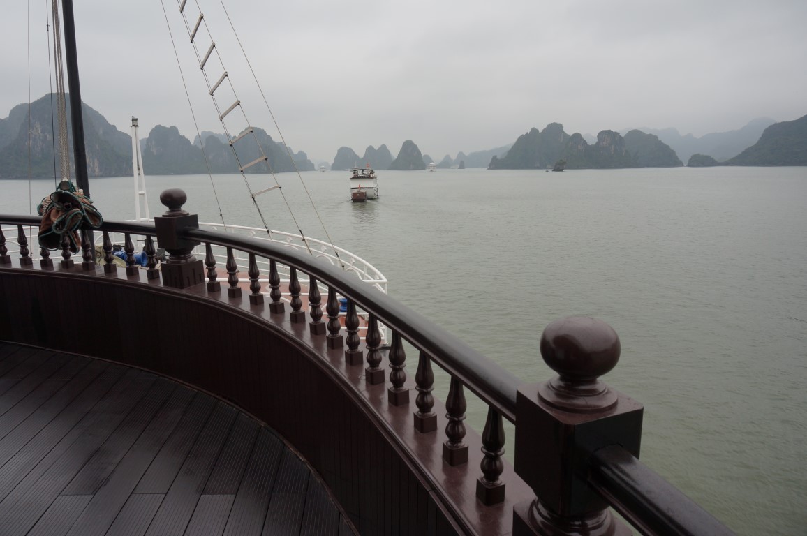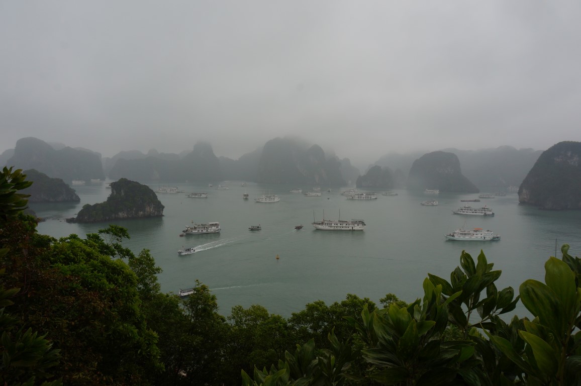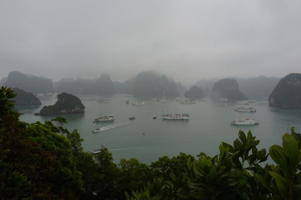 Ik moet – met enige spijt in het hart – zeggen dat de heerlijke weersomstandigheden van gisteren voorbij zijn. Het is opnieuw grijs en grauw in Ha Long Bay. Daardoor ziet de verplichte foto er minder tropisch en vakantieachtig uit dan ik hoopte, maar ach… niks aan te doen. Hoewel het duizelingwekkende landschap zich gedeeltelijk in de laaghangende bewolking verschuilt, besef ik hierboven nogmaals dat Ha Long Bay een prachtige plek is. Het is onderdeel van de New 7 Wonders of Nature en ik begrijp goed waarom. Vorig jaar bezocht ik een andere bezienswaardigheid uit deze lijst en Ha Long Bay moet er absoluut niet voor onderdoen.