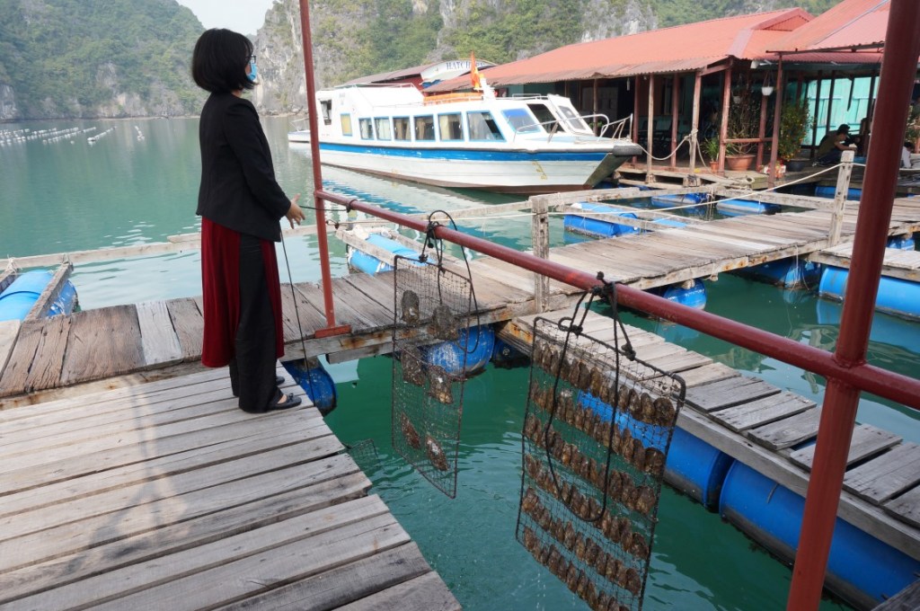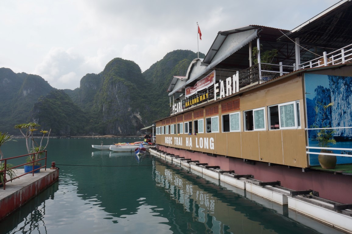 Na de lunch gaan we opnieuw van boord. Deze keer bezoeken we de Pearl Farm, een halte waar vooral de dames fel naar uit kijken. Deze locatie heeft niks te maken met een oorlogsbasis op Hawaii en nog minder met een rockband uit Seattle. Neen, dit is letterlijk een kweekplaats voor parels. De parelkwekerij is een soort drijvend dorp in een oogstrelende inham van Ha Long Bay. Het is kleinschalig en de barakken ogen best ouderwets, maar al bij al valt er wel interessante informatie te rapen. Aan de ingang werd een soort miniatuurmuseum ingericht en men vertelt ook hoe parels gekweekt worden. Het is een tijdrovend proces, want de grotere parels moeten wel tien jaar groeien. Dat geeft het personeel voldoende tijd om aangespoelde toeristen een rondleiding te geven, lijkt me.
