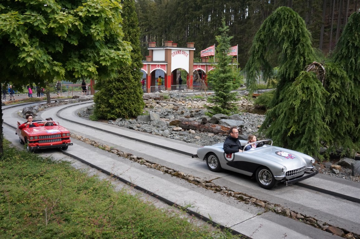 Fort Fun ligt nabij het plaatsje Wasserfall en dat is op maandagochtend best een toepasselijke naam. Wanneer we rond elf uur op de parkeerplaats arriveren, valt het water inderdaad met bakken uit de hemel. Onze weer-app belooft echter beterschap en die komt er vlugger dan verwacht. Tien minuten later klaart de hemel namelijk op en vanaf dan mogen we genieten van een frisse, maar zonnige zomerdag. Een zomerdag die we overigens starten met een eerste portie rodelplezier. Fort Fun heeft met Trapper Slider een behoorlijk stevige Alpine Coaster in huis. Het ding is maar liefst 1,3 kilometer lang en hij bereikt bovendien een imposante hoogte. De rit is pijlsnel wanneer je nauwelijks de rem gebruikt, al toont de gemiddelde bezoeker helaas weinig durf op deze attractie. Gevolg: halverwege de track beland ik achter mijn tergend trage voorliggers en dat haalt de funwaarde van Trapper Slider drastisch omlaag. Desondanks is dit wel een van de spectaculairste Alpine Coasters die ik al deed. Het baanverloop is afwisselend en de rit duurt best lang. Gewoon even duimen dat je voorliggers geen bangeriken zijn… en dat je rugzak niet gestolen werd uit die onbewaakte bagageopslag. Een gratis kluisje zou ik van harte appreciëren.